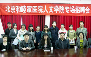 4月8日上午,人文學院承辦了北京和睦家醫院2011屆畢業生專場校園招聘。此次招聘會是人文學院和招生就業處共同努力、精心籌備的結果。我校英語、法學、護理和中藥專業的2011屆畢業生參加了招聘會,其中12名同學被招聘方確定進入實踐工作能力考核環節。