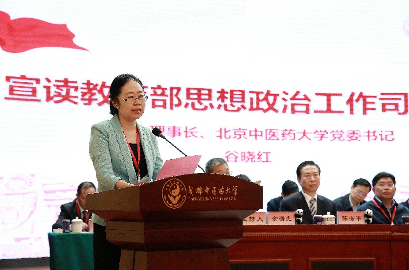 會上,谷曉紅書記作為研究會理事長致開幕詞。她說,黨的十九大深刻闡述新時代黨的歷史使命,確定新時代的奮斗目標和戰略安排,對新時代推進中國特色社會主義偉大事業和黨的建設新的偉大工程作出全面部署。十九大報告提出的“堅持中西醫并重,傳承發展中醫藥事業”,充分體現了黨中央對中醫藥發展的高度重視,為新時代推動中醫藥振興發展提供了遵循、指明了方向。高等中醫藥院校,是中醫藥事業的人才培養基地、科學研究基地、醫療服務基地、文化傳播基地、合作交流基地,責任重大,使命光榮。同時,中醫藥院校在全國高校中獨具特色,發揮著獨特作用,因此要在堅持社會主義辦學方向的基礎上,突出中醫特色、突出中國特色、突出文化特色。要深入研究中醫藥高等院校的黨建和思想政治工作,堅定推進全面從嚴治黨,加強各級黨組織建設,扎實推進思想政治工作,為學校改革發展保駕護航,全面提升辦學實力,全面深化教育改革,不斷增強高等中醫藥院校和民族醫藥院校為祖國醫療衛生事業、中醫藥事業和高等教育事業服務的能力。