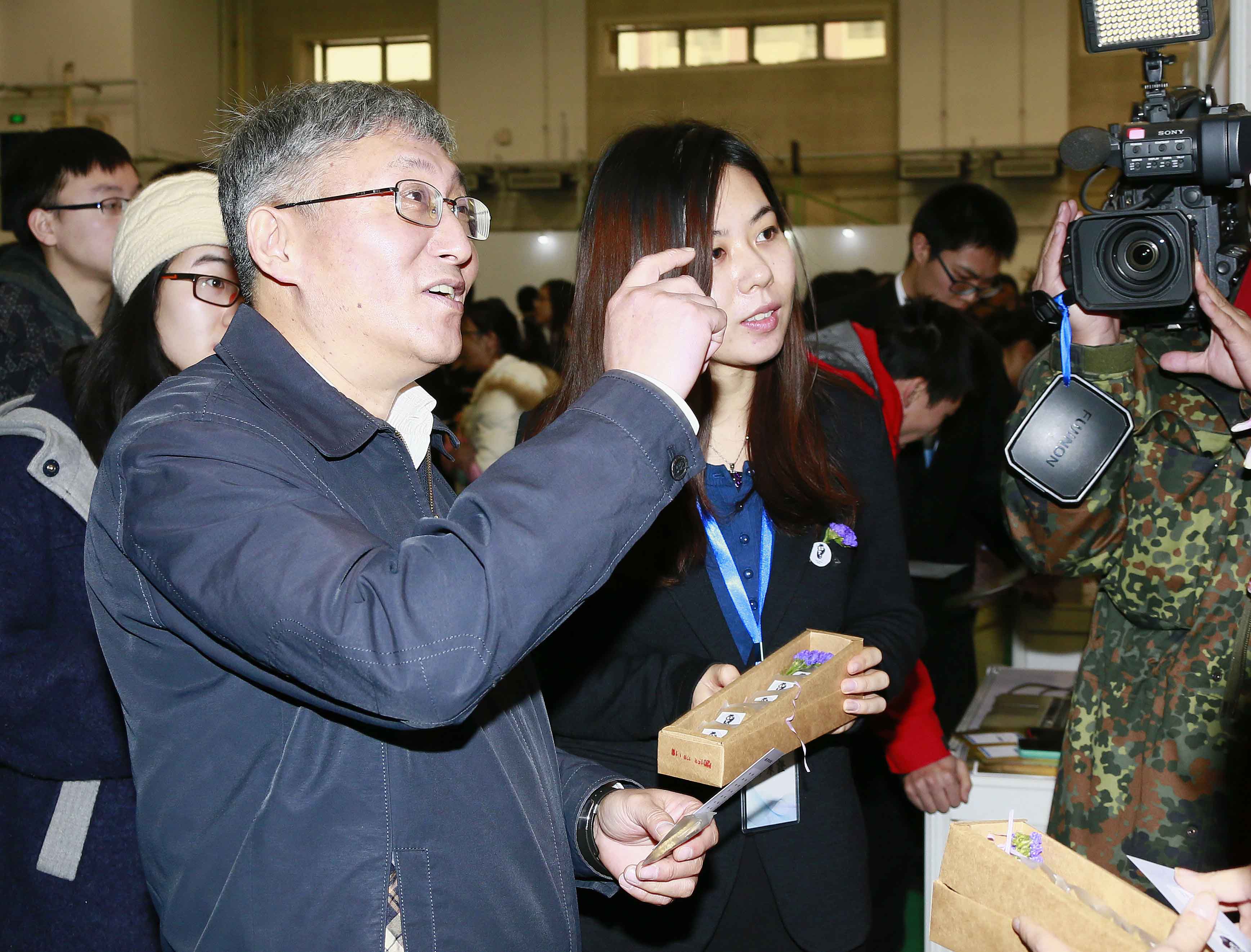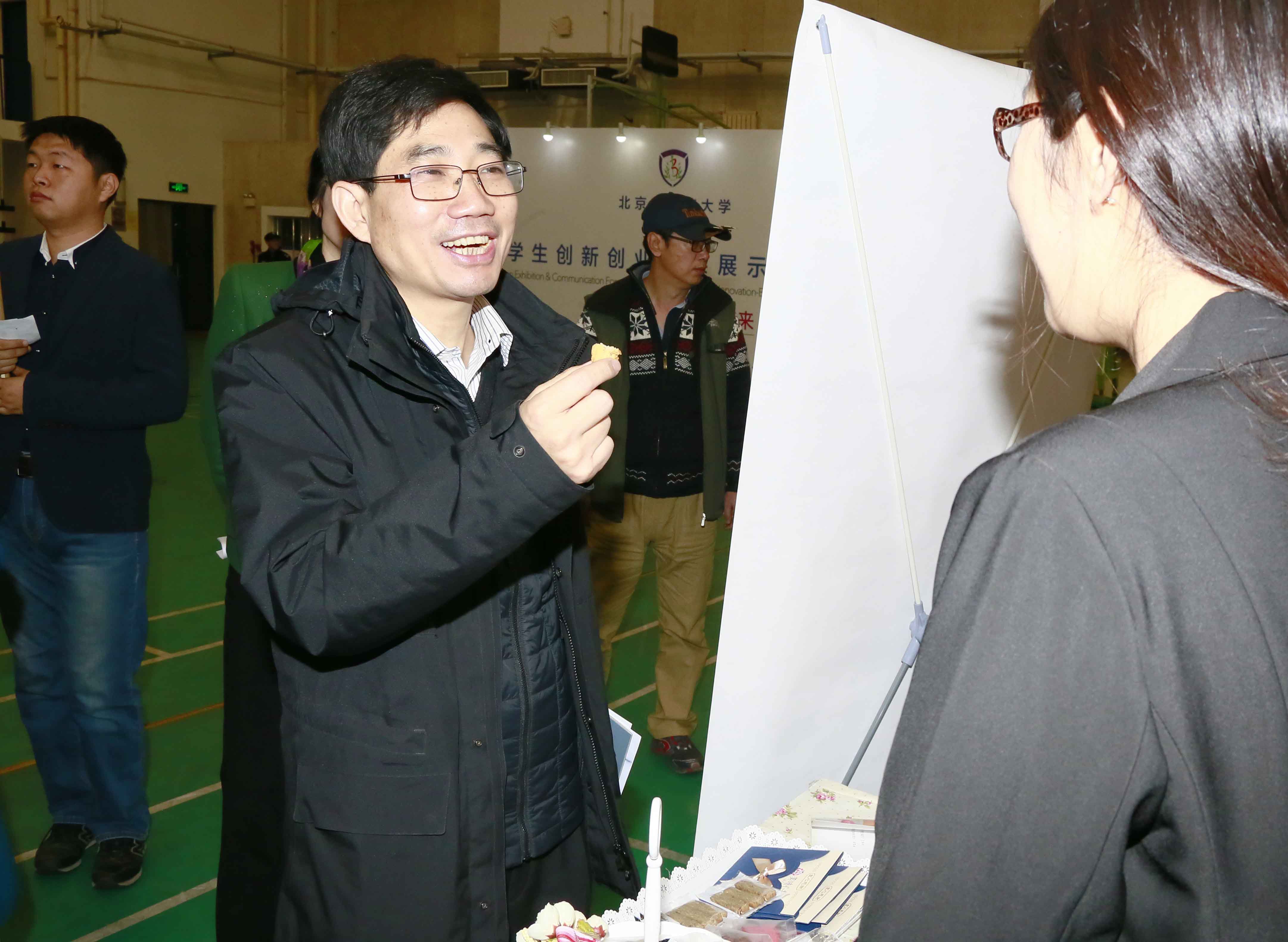 頒獎(jiǎng)典禮結(jié)束后,因事務(wù)繁忙未能參加開(kāi)幕式的校長(zhǎng)徐安龍來(lái)到展覽現(xiàn)場(chǎng),與各位領(lǐng)導(dǎo)一起參觀(guān)展覽,并與同學(xué)們交談,對(duì)部分參展作品提出了建議。參加此次成果展示的項(xiàng)目共計(jì)57項(xiàng),包括我校2013及2014年立項(xiàng)并通過(guò)結(jié)題驗(yàn)收的國(guó)家級(jí)大學(xué)生創(chuàng)新創(chuàng)業(yè)訓(xùn)練計(jì)劃和北京市大學(xué)生科學(xué)研究與創(chuàng)業(yè)行動(dòng)計(jì)劃項(xiàng)目中遴選出來(lái)的優(yōu)秀團(tuán)隊(duì)47項(xiàng),2014和2015年學(xué)術(shù)保研同學(xué)的學(xué)術(shù)論文8項(xiàng),以及校外競(jìng)賽獲獎(jiǎng)代表作品2項(xiàng),各項(xiàng)目通過(guò)展版、模型、實(shí)物、圖片、電腦演示等多種形式展示了我校學(xué)生在基礎(chǔ)性課題研究、學(xué)術(shù)論文、創(chuàng)業(yè)設(shè)計(jì)與構(gòu)想等多方面的成果。另有四個(gè)項(xiàng)目組在學(xué)術(shù)論壇環(huán)節(jié)還與其他同學(xué)分享了他們的成果和經(jīng)驗(yàn)。同時(shí),創(chuàng)業(yè)實(shí)踐團(tuán)隊(duì)參加了首屆“創(chuàng)星之戰(zhàn)”創(chuàng)新創(chuàng)業(yè)團(tuán)隊(duì)爭(zhēng)霸賽,各團(tuán)隊(duì)運(yùn)用新穎的形式展示項(xiàng)目成果,部分項(xiàng)目還引起了一些企業(yè)的合作興趣。