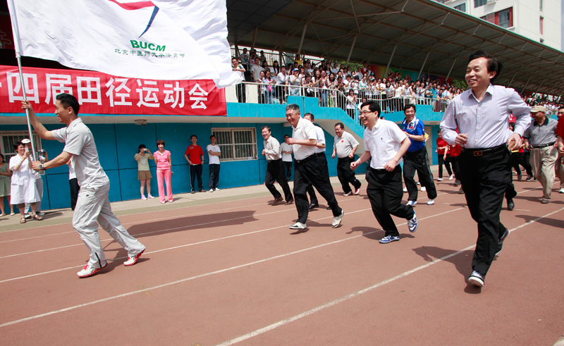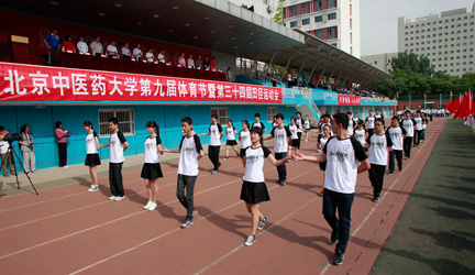 5月15日上午,以“青春岐黃夢 活力杏林風”為主題的北京中醫藥大學第九屆體育節暨第34屆田徑運動會開幕式在西校區體育場舉行。在國旗、校旗和體育節會旗的引導下,全校共61個方隊的2000余名師生參加了入場式。