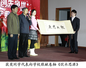 最后,獲獎同學代表向?qū)W校敬獻卷軸《飲水思源》一幅,表達了對學校、老師的感激之情。頒獎典禮在校歌《承諾》中圓滿落幕。