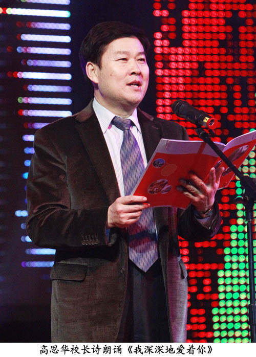 晚會在開場DV秀和精彩的開場舞中緩緩拉開序幕。首先由高思華校長飽含深情地朗誦了他創作的詩歌《我深深地愛著你》(附篇后),感染了全場每一名觀眾,贏得了多次熱烈的掌聲。之后來自我校武術隊和健美操隊的全國冠軍,為大家獻上了精彩絕倫的武術表演和活力四射的健美操表演;來自臺港澳、國際學院的學生代表,來自中國戲曲學院和中央音樂學院的同學們以及晚會特邀嘉賓紅櫻束打擊樂團為現場觀眾帶來了形式多樣的絢麗表演。晚會上,學校領導與教師也為同學們表演了精彩紛呈的節目。