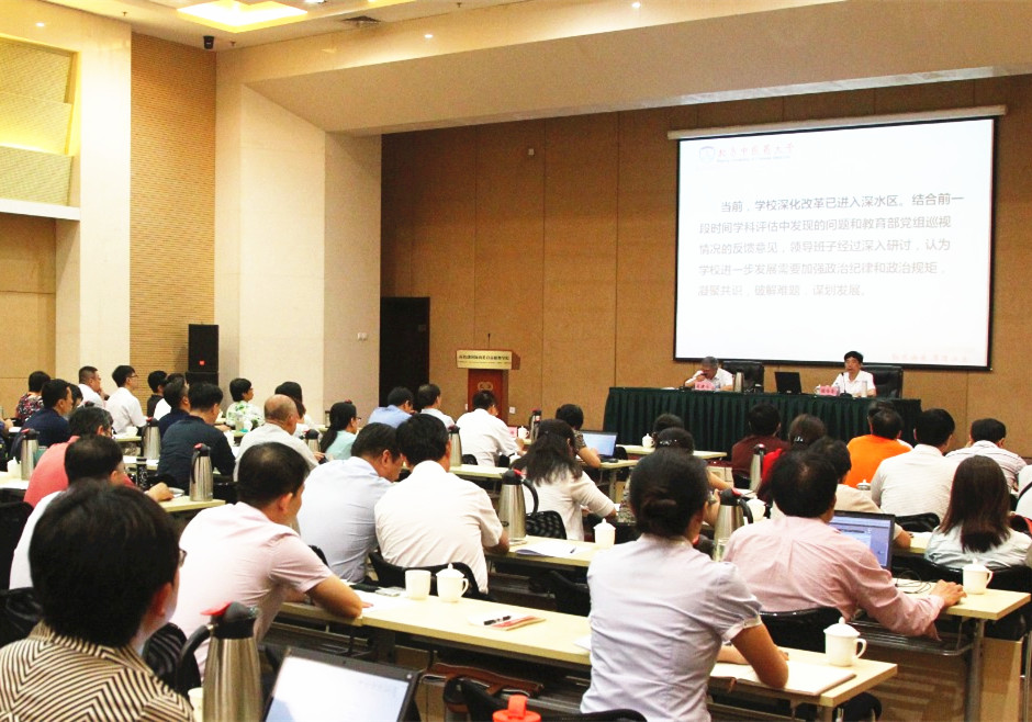 教育部黨組第三巡視組向北京中醫藥大學反饋巡視情況2016年7月6日,教育部巡視組巡視工作意見反饋會在北京中醫藥大學召開。參加會議的有:教育部黨組第三巡視組組長簡大鈞同志、副組長周玲同志,教育部巡視工作辦公室副主任牛燕冰同志、巡視一處處長胡志剛同志,學校領導班子成員,校黨委委員、紀委委員,近期退出領導崗位的校級領導干部,人大代表、政協委員,民主黨派負責人,全校正處級干部,離退休人員代表,教師代表,學生代表等。校長徐安龍主持會議。082016-07