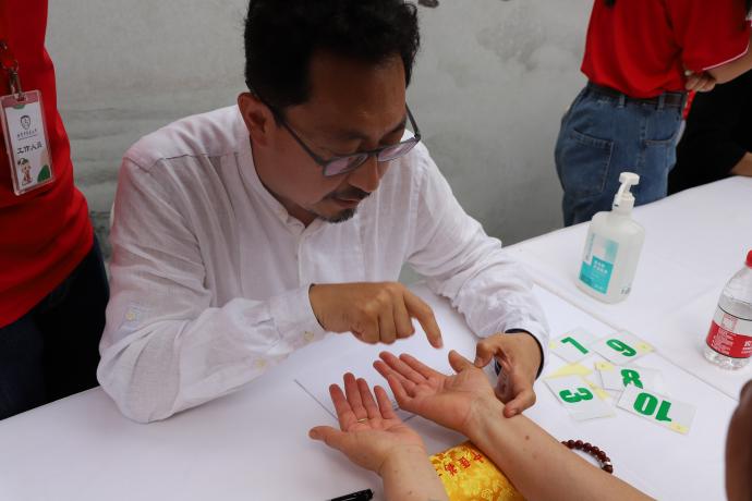 開(kāi)幕式結(jié)束后,義診活動(dòng)正式開(kāi)始。我校的中醫(yī)藥臨床專(zhuān)家,以及包括國(guó)際學(xué)生、港澳臺(tái)學(xué)生的中醫(yī)專(zhuān)業(yè)在校生為廣大市民群眾以及在京工作生活的國(guó)際友人提供中醫(yī)四診、推拿及耳豆療法等健康服務(wù)。我校體育部專(zhuān)家還在現(xiàn)場(chǎng)教授傳統(tǒng)導(dǎo)引術(shù)--八段錦的教學(xué)。此外,活動(dòng)還準(zhǔn)備了養(yǎng)生藥茶及中藥香囊,讓大家在趣味互動(dòng)中了解中醫(yī)養(yǎng)生知識(shí)。活動(dòng)運(yùn)用多種形式,調(diào)動(dòng)參與者多重感官,從中醫(yī)診斷、特色治療方法、養(yǎng)生理念等方面為廣大市民及國(guó)際友人帶來(lái)立體、沉浸的中醫(yī)文化體驗(yàn)。大家紛紛表示感受到了中醫(yī)藥的魅力,對(duì)中醫(yī)藥文化的傳遞的健康精神和中醫(yī)診療技術(shù)的功效給予高度評(píng)價(jià)。