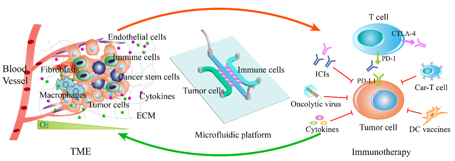 該文重點介紹了用于研究TME和免疫系統之間相互作用的腫瘤器官芯片的最新進展。首先介紹了在微流控平臺上模擬TME所需要的各類要素條件,包括3D細胞培養、細胞外基質、細胞共培養與相互作用、脈管系統、生化因子梯度、缺氧微環境、生物力學作用等。然后介紹了在微流控腫瘤模型中進行的各類免疫療法研究,包括過繼細胞轉移、免疫檢查點抑制劑、癌癥疫苗、溶瘤病毒、以及細胞因子療法等。同時對微流控腫瘤模型在研究腫瘤-免疫系統相互作用方面,以及個性化免疫治療的臨床應用前景進行了概述和展望。