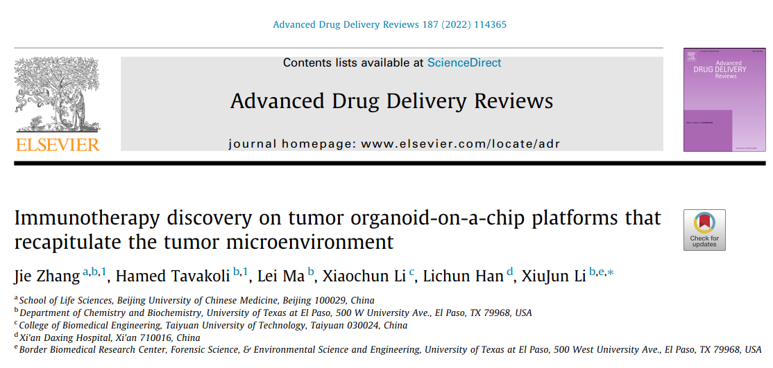 近日,我校生命科學學院青年教師張潔在藥學權威期刊Advanced Drug Delivery Reviews(JCR藥學1區)上發表題為“Immunotherapy discovery on tumor organoid-on-a-chip platforms that recapitulate the tumor microenvironment”的綜述。該文系統總結了在微流控平臺上模擬腫瘤微環境的各種要素,以及所開展的各種腫瘤免疫療法的研究進展。生科院青年教師張潔與美國得州大學埃爾帕索分校Hamed Tavakoli為共同第一作者,美國得州大學埃爾帕索分校教授XiuJun Li為通訊作者,我校生命科學學院為第一單位。