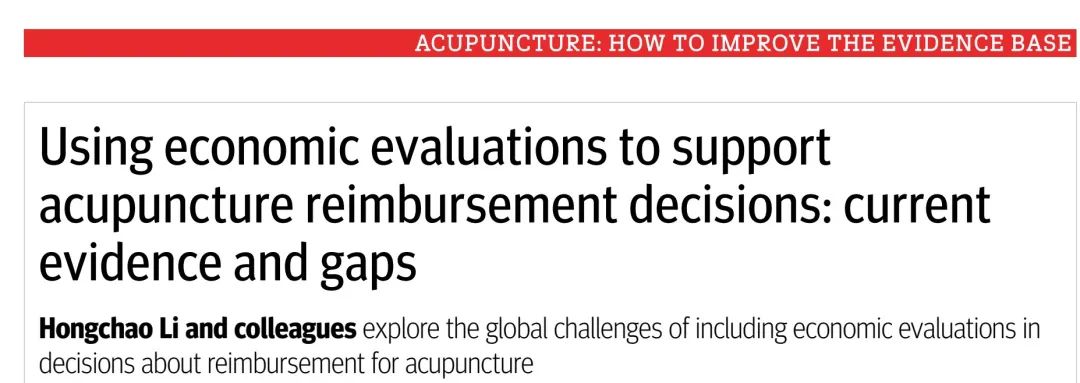 另一篇文章題為《使用衛(wèi)生經(jīng)濟學(xué)評價支持針灸報銷決策的現(xiàn)有證據(jù)和差距》(Using economic evaluations to support acupuncture reimbursement decisions: current evidence and gaps),由中國藥科大學(xué)李洪超副教授和北京中醫(yī)藥大學(xué)循證醫(yī)學(xué)中心金雪晶教授作為共同第一作者,匯集了來自中國藥科大學(xué)、上海復(fù)旦大學(xué)、中國中醫(yī)科學(xué)院、加拿大麥克馬斯特大學(xué)、瑞士蘇黎世大學(xué)、美國塔夫茨醫(yī)療中心、RAND公司的相關(guān)學(xué)者。