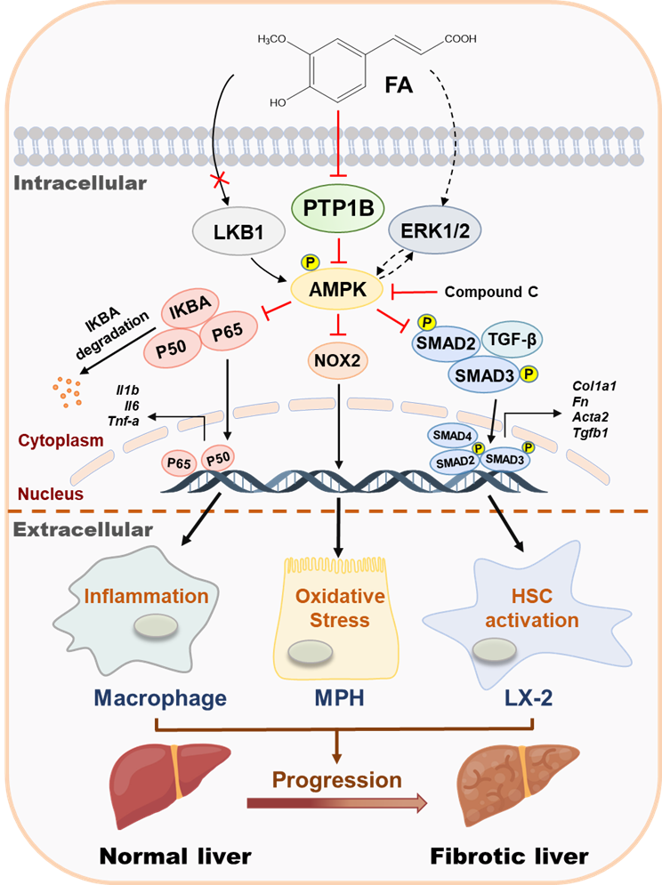 近日,我校生命科學學院李曉驕陽教授在影響因子5.81分的雜志Frontiers in Pharmacology(藥理學JCR一區)上以通訊作者,北京中醫藥大學生命科學學院為第一完成單位發表題為“Ferulic acid ameliorates hepatic inflammation and fibrotic liver injury by inhibiting PTP1B activity and subsequent promoting AMPK phosphorylation(阿魏酸通過抑制蛋白酪氨酸磷酸酶1B活性進而促進AMP依賴的蛋白激酶磷酸化改善炎性肝纖維化)”的學術論文,該研究采用基于分子對接、表面等離子共振及免疫共沉淀等多種分子生物學技術,系統性闡明了中藥單體成分阿魏酸對肝臟炎癥和纖維化的治療作用及其潛在機制。該研究為中藥天然產物治療肝臟纖維化和其晚期并發癥提供了重要的理論支持。