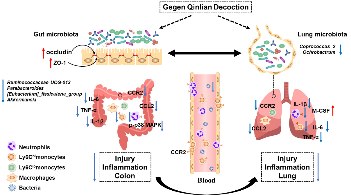 葛根芩連湯是治療UC或急性肺損傷的中醫(yī)經(jīng)典方藥。課題組前期研究表明,該復(fù)方可通過上調(diào)UC小鼠結(jié)腸緊密連接蛋白表達(dá)以修復(fù)腸道黏膜屏障功能。本研究進(jìn)一步發(fā)現(xiàn)葛根芩連湯能下調(diào)腸道和肺部炎性細(xì)胞因子(TNF-α、IL-1β、IL-6)的表達(dá)、抑制CCL2/CCR2趨化因子信號(hào)軸的激活,進(jìn)而減少中性粒細(xì)胞和炎性單核細(xì)胞的募集,改善UC小鼠腸道和肺部損傷。同時(shí),該復(fù)方可通過降低糞便中Ruminococcaceae UCG-013,Parabacteroides,[Eubacterium]_fissicatena_group和Akkermansia等的豐度,抑制肺部Coprococcus 2和Ochrobactrum的繁殖,恢復(fù)腸道和肺部微生態(tài)平衡。這些標(biāo)志性細(xì)菌與髓性免疫細(xì)胞及其炎性細(xì)胞因子之間呈顯著相關(guān)。本研究認(rèn)為葛根芩連湯抑制炎性髓系免疫細(xì)胞的招募和細(xì)胞因子過度分泌,重塑腸-肺軸之間的免疫與菌群穩(wěn)態(tài),從整體上緩解UC及其并發(fā)的肺損傷。該研究結(jié)果同時(shí)從中醫(yī)理論和臨床用藥實(shí)踐出發(fā),為拓寬經(jīng)方葛根芩連湯的臨床用藥范圍提供了理論支撐。