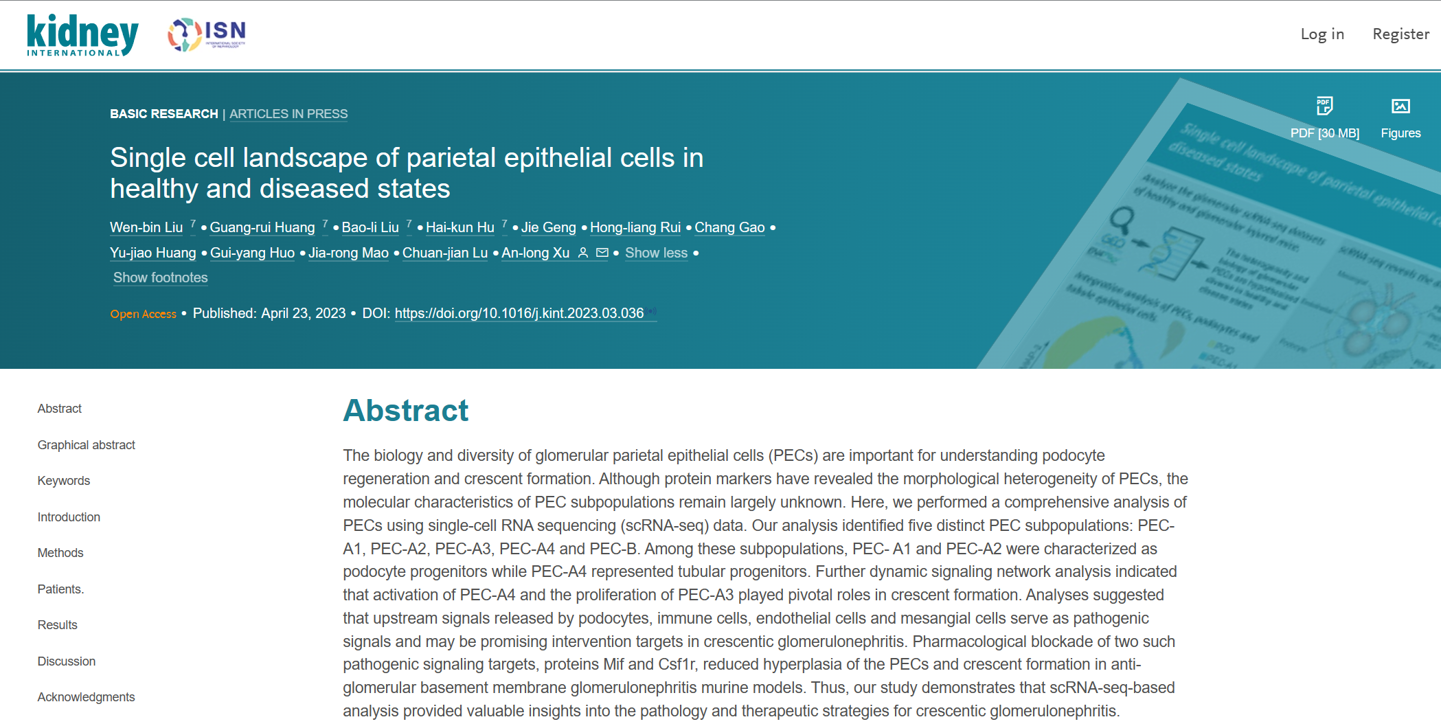 4月23日,我校生命科學學院徐安龍教授課題組于腎臟病權威期刊《Kidney International》上在線發表題為“Single cell landscape of parietal epithelial cells in healthy and diseased states”的研究論文。