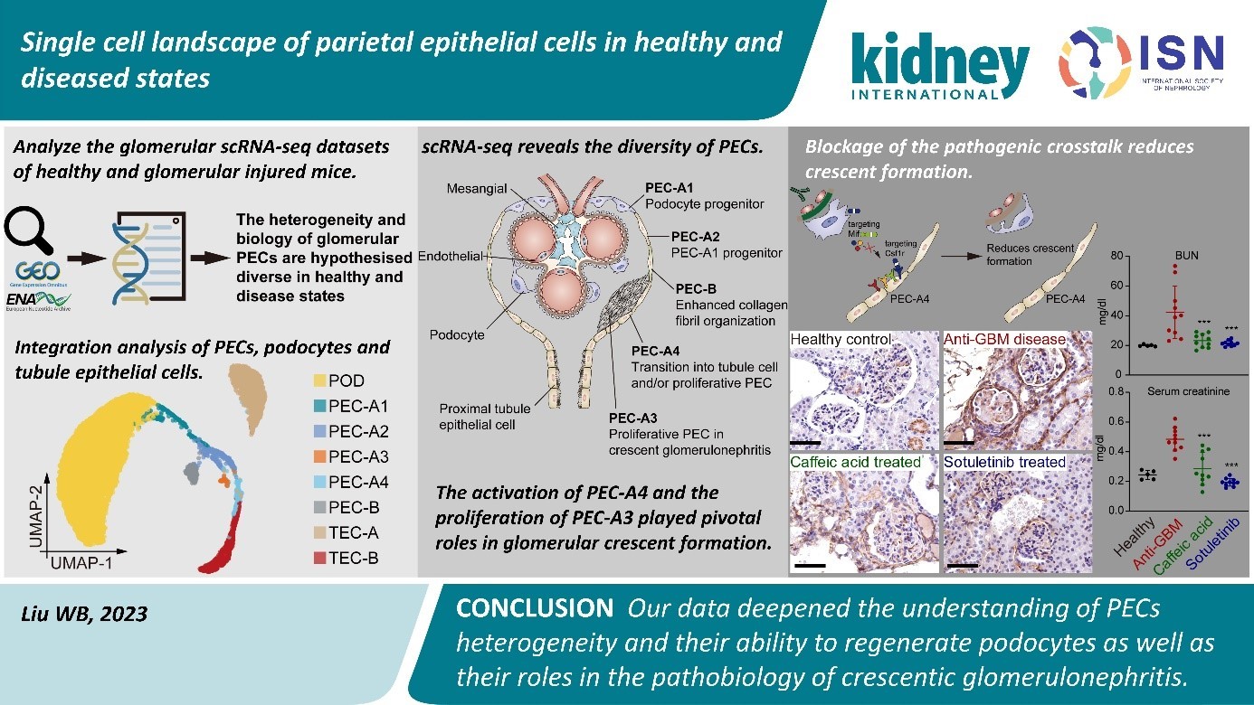 該研究首次建立了腎小球壁層上皮細胞(parietal epithelial cells, PECs)的單細胞圖譜并分析了PECs的亞群組成及其生物學功能,深入探討了PECs的不同亞群在腎小球足細胞損傷修復和腎小球新月體形成中的作用。基于單細胞分析,該研究進一步篩選出了干預腎小球新月體形成的靶點蛋白Mif和Csf1r,并篩選出中藥小分子咖啡酸等驗證了其抑制小鼠新月體腎小球形成的效果,為新月體腎小球腎炎的臨床治療提供了新思路,尤其是為闡述中醫藥治療腎臟病的機理提供了重要參考。