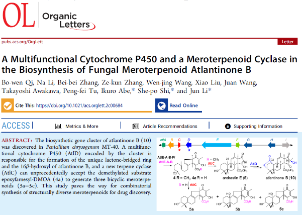 我校中藥現(xiàn)代研究中心團(tuán)隊(duì)在藥用植物內(nèi)生真菌次生代謝產(chǎn)物Atlantinone B生物合成機(jī)制方面的相關(guān)研究成果以“A Multifunctional Cytochrome P450 and a Meroterpenoid Cyclase in the Biosynthesis of Fungal Meroterpenoid Atlantinone B”為題在線發(fā)表于自然指數(shù)期刊Organic Letters。中藥現(xiàn)代研究中心博士研究生齊博文為論文第一作者,北京中醫(yī)藥大學(xué)李軍、史社坡研究員,日本東京大學(xué)Ikuro Abe教授為論文通訊作者。