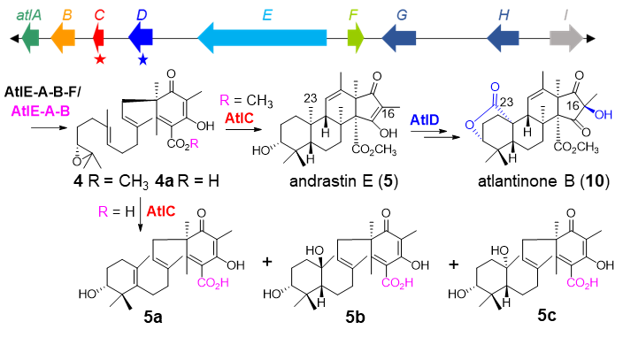 藥用植物內(nèi)生菌與宿主植物的生長、發(fā)育密切相關(guān),在體外發(fā)酵培養(yǎng)時(shí)能夠產(chǎn)生大量結(jié)構(gòu)新穎多樣的活性代謝產(chǎn)物,是創(chuàng)新藥物發(fā)現(xiàn)的天然寶藏。對藥用植物內(nèi)生菌進(jìn)行系統(tǒng)研究,有利于藥用植物資源的合理、充分利用。中藥現(xiàn)代研究中心團(tuán)隊(duì)前期從珍稀藥用植物蛇足石杉(Huperzia serrata)內(nèi)生真菌中分離鑒定出一系列結(jié)構(gòu)新穎、活性顯著的代謝產(chǎn)物。在此基礎(chǔ)上,中心團(tuán)隊(duì)與日本東京大學(xué)Ikuro Abe教授合作,結(jié)合基因組測序,首次從蛇足石杉的一株內(nèi)生真菌Penicillium chrysogenum MT-40中發(fā)現(xiàn)了負(fù)責(zé)合成具有獨(dú)特內(nèi)酯環(huán)結(jié)構(gòu)雜萜類成分atlantinone B的生物合成基因簇atl,在米曲霉(Aspergillus oryzae NSAR1)中重構(gòu)了atlantinone B的生物合成途徑,并鑒定了atl基因簇中各基因編碼蛋白的催化功能。研究成果為利用合成生物學(xué)手段組合合成結(jié)構(gòu)多樣的活性雜萜類分子奠定了基礎(chǔ)。
