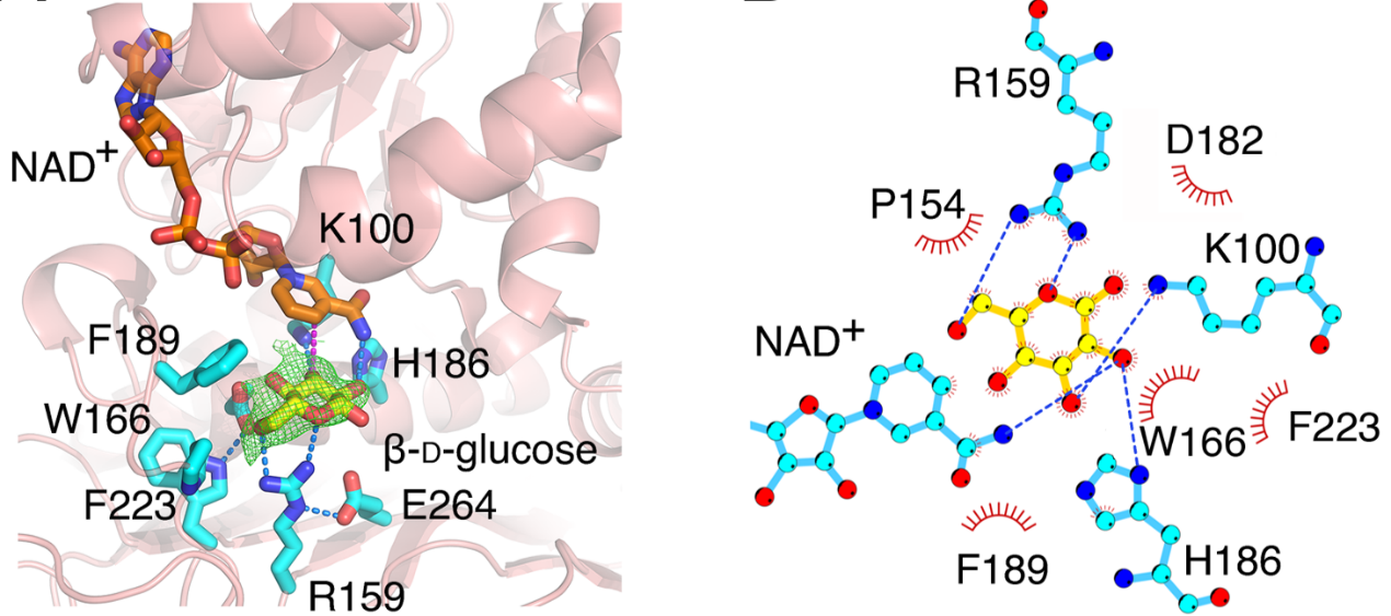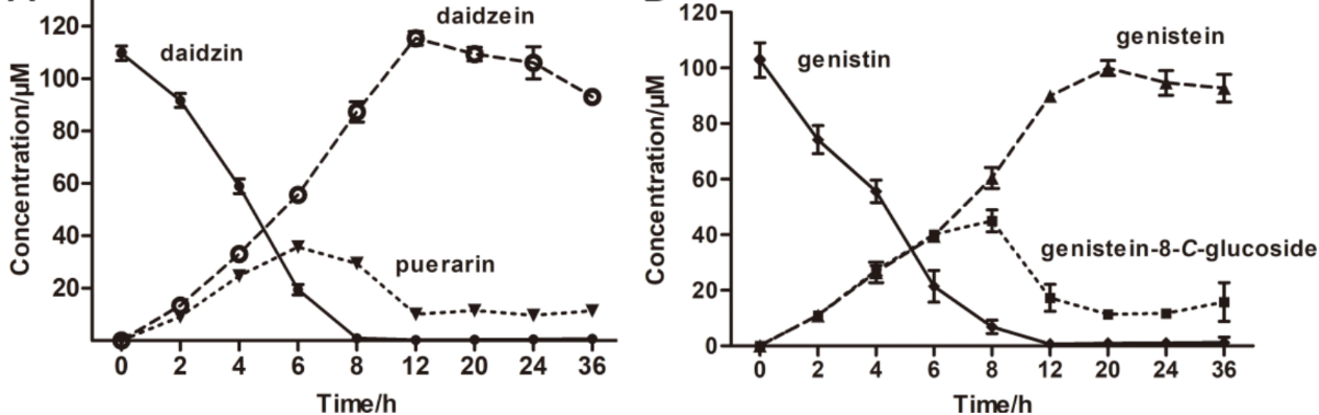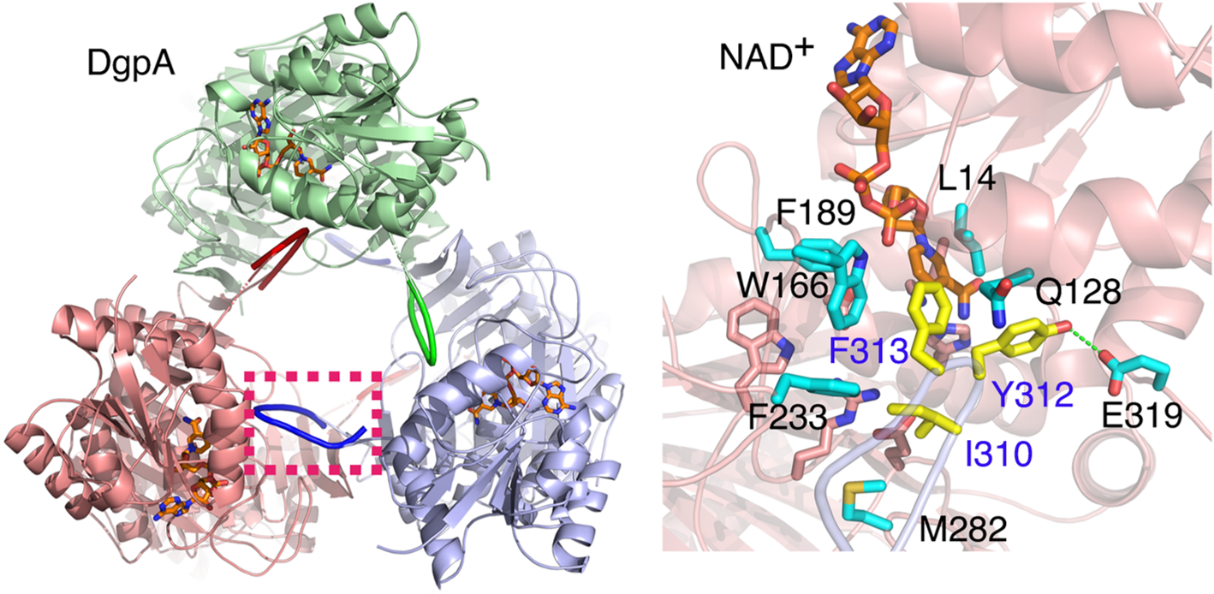 黃酮碳苷類化合物廣泛存在于多種中藥中,是中藥發揮藥效的重要成分之一。此類成分包括葛根素、葒草素、牡荊素等的糖基以C-C單鍵與苷元連接。由于C-糖苷鍵的特殊穩定性,導致碳苷類中藥成分大多難以被代謝。而人源腸道菌PUE分泌的DgpA/B/C蛋白質復合物能夠特異性地切割葛根素的C-糖苷鍵這一過程的分子機理并不明確。我校生命科學學院馬文福團隊與王如峰團隊合作首次解析了DgpA與底物結合的復合物晶體結構,發現了DgpA/B/C既是一類碳苷類裂解酶,同時也是轉化氧苷到碳苷類的異構酶。這些發現不僅揭示了酶介導的C-糖苷鍵斷裂機制,而且可為碳苷類化合物的生物合成研究提供新思路。