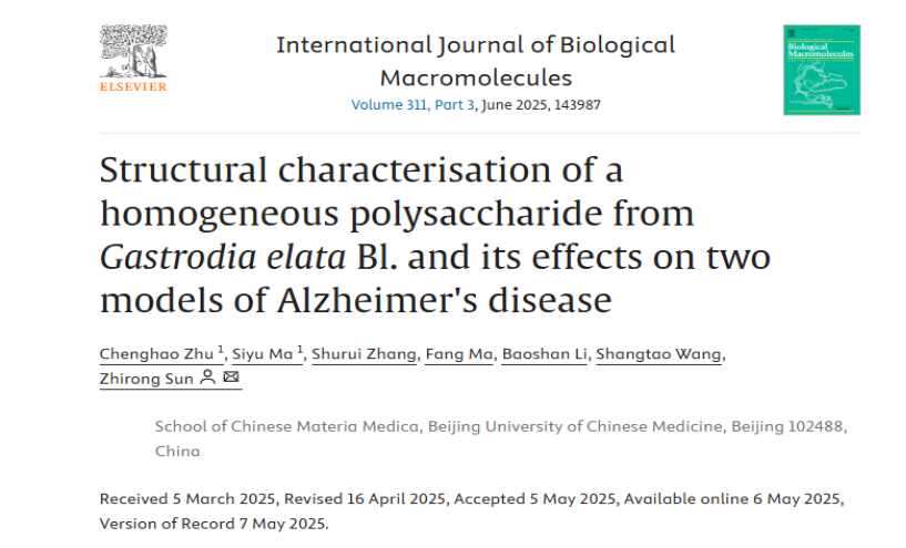 以上研究結果以“Structural characterisation of a homogeneous polysaccharide from Gastrodia elata Bl. and its effects on two models of Alzheimer's disease”為題發表在International Journal of Biological Macromolecules(一區TOP期刊,IF 7.7)上。中藥學院博士研究生朱成豪為第一作者,孫志蓉教授為通訊作者,該研究得到了國家中藥材產業技術體系項目和陜西寧強縣科技攻關項目的資助。