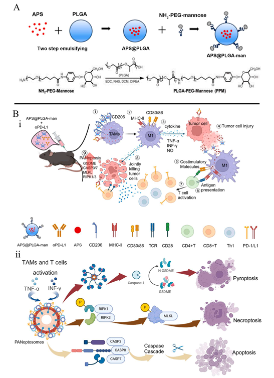 該創新方法通過巧妙的設計思路,將黃芪多糖封裝于納米載體中,顯著增強了APS在體內外的穩定性,同時通過表面修飾賦予其對TAMs的主動靶向能力(APM)。由于該納米顆粒具有pH敏感性,在TAMs攝取后,可在細胞內環境中促進APS釋放,加速M1型極化過程。這一設計不僅確保了藥物安全性,還廣泛促進了TAMs的M1型極化以殺傷腫瘤細胞,同時富集腫瘤相關抗原,尤其是具有強大免疫原性的DAPMs和新抗原,顯著增強巨噬細胞的抗原呈遞能力,激活CD8+T細胞和Th1細胞。由此產生豐富的多樣性細胞因子可誘導腫瘤細胞發生不可逆PANoptosis,進一步釋放大量腫瘤抗原,形成正反饋環路,觸發強大且持久的抗癌效應,最終獲得顯著的抑瘤效應和生存獲益。與免疫檢查點抑制劑聯用可取得良好的協同增效作用。