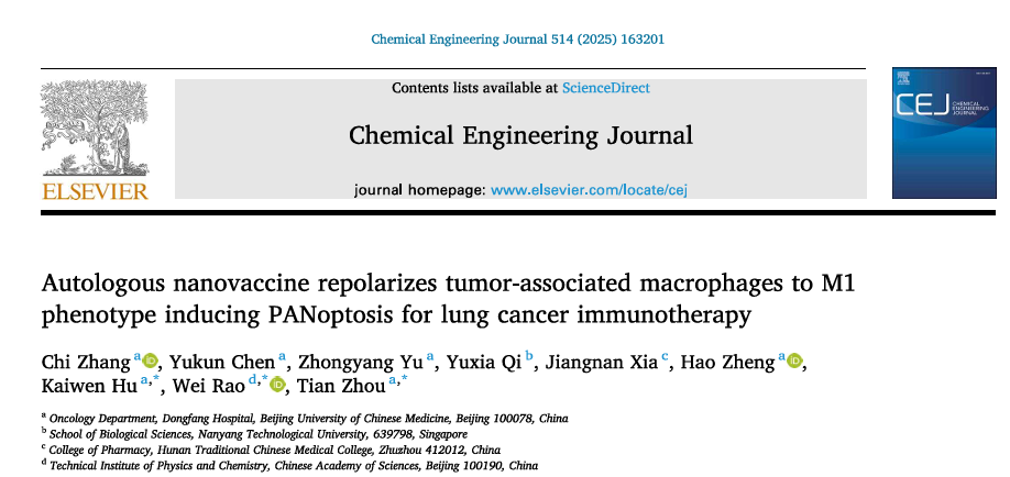 近日,北京中醫藥大學東方醫院胡凱文、周天團隊和中國科學院理化技術研究所低溫科學與技術全國重點實驗室饒偉團隊聯合在Chemical Engineering Journal上以“Autologous Nanovaccine Repolarizes Tumor-Associated Macrophages to M1 Phenotype Inducing PANoptosis for Lung Cancer Immunotherapy”為題,在線發表了成功研發主動靶向巨噬細胞的治療性黃芪多糖自體腫瘤納米疫苗的研究論文(IF=13.4,中科院1區TOP ,JCR 1區),再次展示了醫工結合、中西醫結合治療癌癥的應用潛力。該研究基于中醫 “扶正祛邪”經典理論,從全新角度詮釋了在癌癥治療領域“扶正以祛邪”的現代內涵。該研究得到了國家自然科學基金面上項目資助。