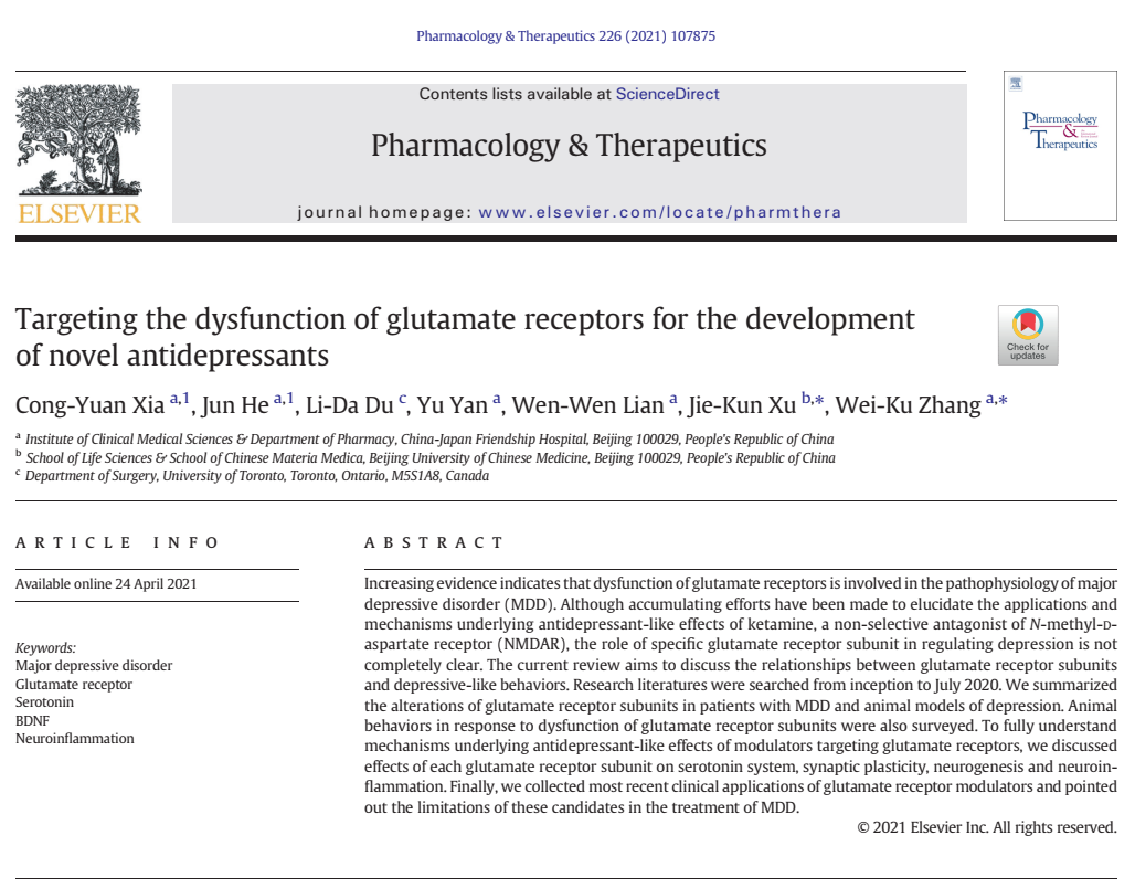 近日,我校生命科學學院續(xù)潔琨教授受邀在藥學權(quán)威期刊 Pharmacology & Therapeutics(JCR藥學1區(qū))上發(fā)表題為“Targeting the dysfunction of glutamate receptors for the development of novel antidepressants”的綜述,該文系統(tǒng)總結(jié)了靶向谷氨酸受體的抗抑郁藥物的研究進展,并分析了存在的挑戰(zhàn)。