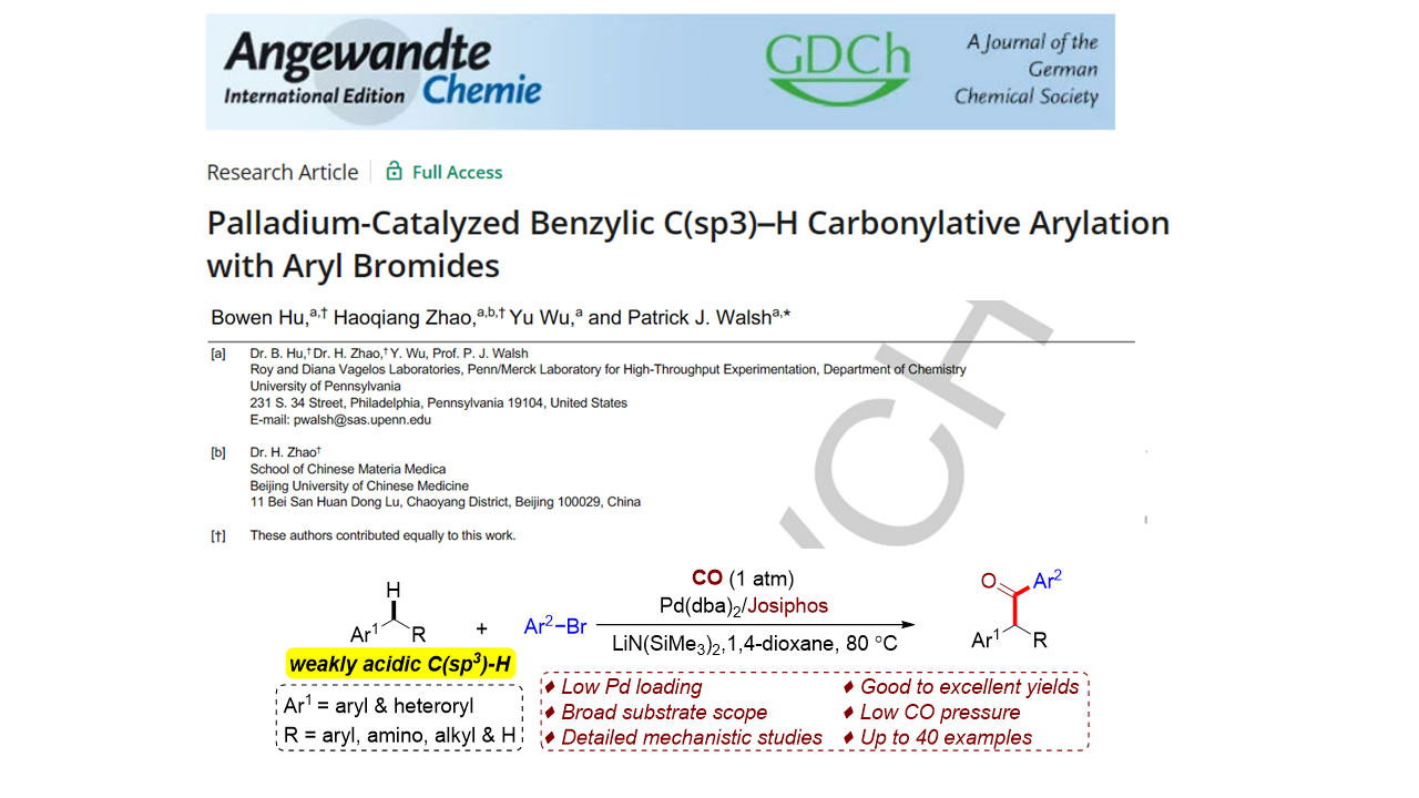 近日,我校中藥學院青年教師趙浩強博士與美國賓夕法尼亞大學合作在化學權威學術期刊Angewandte Chemie International Edition(自然指數期刊,中科院一區TOP期刊)上發表題為“Palladium-Catalyzed Benzylic C(sp3)–H Carbonylative Arylation with Aryl Bromides”(https://doi.org/10.1002/anie.202300073)的高水平論文。