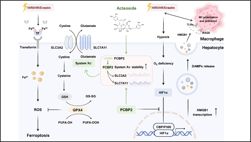 基于肝移植過程中基礎性的肝臟缺血再灌注損傷(HIRI),受啟于肝細胞鐵死亡過程中SLC家族氨基酸跨膜家族蛋白SLC7A11和SLC3A2(構成轉運系統Xc-)穩定性受損,李曉驕陽課題組發現中藥熟地黃有效成分毛蕊花糖苷(ACT)可通過調節聚(rC)結合蛋白2(PCBP2)恢復SLCs跨膜轉運系統的mRNA穩定性,同時干預組蛋白乙酰轉移酶家族因子p300激活缺氧誘導因子HIF1α轉錄活性,以此降低炎性預警蛋白HMGB1的表達和分泌,進而抑制HIRI進程中肝臟微小單元的巨噬細胞募集和免疫環境惡化。此外,通過進一步構建肝細胞靶向PCBP2沉默的小鼠模型,證實了ACT對HIRI的治療效果依賴于PCBP2維持轉運系統Xc-的穩定性和限制HIF1α/P300-HMGB1改善免疫微環境來減輕HIRI進程中的肝細胞鐵死亡發生。該研究首次揭示了RNA結合蛋白PCBP2對鐵死亡明星轉運系統Xc-雙蛋白SLC7A11和SLC3A2的結合和穩定維持作用,創新性地借助多蛋白互作及分子垂釣手段證實了肝細胞鐵死亡進程中的免疫微環境變化,并驗證了天然中藥成分ACT對肝臟缺血再灌注的治療效果(Xiaojiaoyang Li et al., APSB, 2024)。
