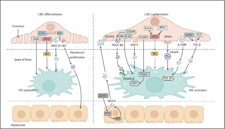 在肝缺血再灌注損傷和肝纖維化等病理過程中,LSEC作為肝臟內部血管系統的組成部分,由于其位于血液與其他肝細胞之間的交界的特殊位置,負責調節物質交換,具有重要的生理功能。另一項研究重點關注了LSEC在肝纖維化中的病理改變。首先總結了LSEC在肝纖維化中的去分化過程,包括毛細血管化、窗孔消失和細胞表型轉變等。在慢性肝損傷中,LSEC去分化不僅改變了其自身特性,還影響了與肝內其它細胞之間的交流,推動了肝纖維化的進程。其次深入探討了LSEC內部穩態和血管分泌信號的調節機制,并發現LSEC的物理和化學特性改變導致其與多種細胞類型之間的正常溝通受損。通過對各種包括中醫藥在內的抗纖維化藥物干預效果和最新調控機制進行系統總結和討論,研究為LSEC在肝纖維化病理生理學中的復雜作用提供了深入見解(Xiaojiaoyang Li et al., Clin Mol Hepatol, 2024)。該研究發表后得到耶魯大學Yasuko Iwakiri教授的高度肯定,并發表題為“Unlocking the Role of Liver Sinusoidal Endothelial Cells: Key Players in Liver Fibrosis”的社論,全面論述了LSEC的結構變化,包括窗孔和毛細血管化、一氧化氮依賴的LSEC與肝星狀細胞(HSC)通訊、LSEC的清除能力以及異質性(Yasuko Iwakiri, Clin Mol Hepatol, 2024)。受Clinical And Molecular Hepatology雜志邀請,課題組再次對該社論做出題為“Correspondence on Letter regarding ‘Liver Sinusoidal Endothelial Cell: An Important Yet Often Overlooked Player in the Liver Fibrosis’”的回應,進一步探討了尋找LSEC及其窗孔的特異性標志物對于揭示LSEC的復雜生理病理學的意義,揭示了LSEC對靶向療法的開發具有巨大的應用前景,以及中藥抑制肝纖維化病理性血管生成的潛力(Xiaojiaoyang Li et al., Clin Mol Hepatol, 2024)。