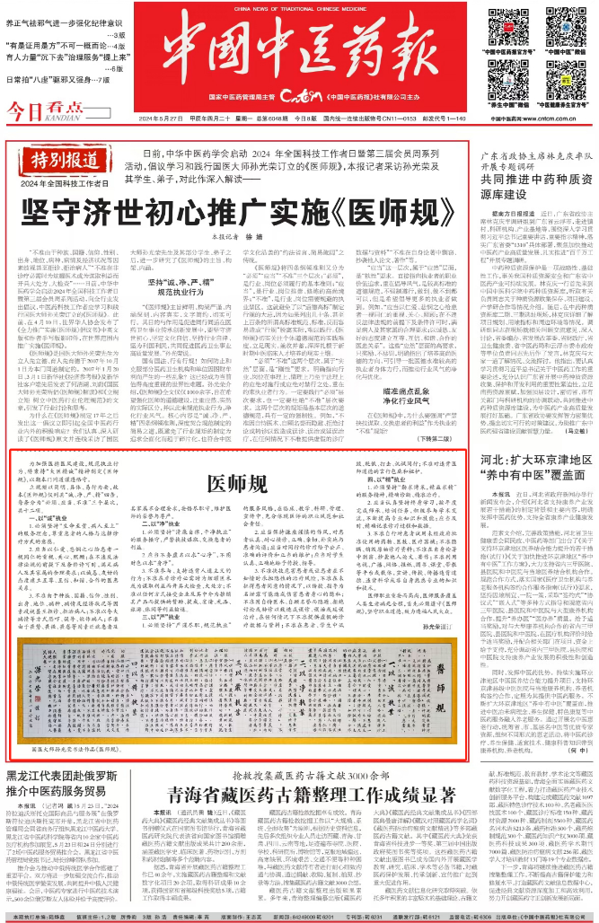 日前,中華中醫(yī)藥學(xué)會啟動2024年全國科技工作者日(5月30日)暨第三屆會員周系列活動,倡議學(xué)習(xí)和踐行國醫(yī)大師孫光榮訂立的《醫(yī)師規(guī)》。《中國中醫(yī)藥報》采訪了國醫(yī)大師孫光榮及其學(xué)生、弟子并進(jìn)行深入解讀,于5月27日頭版作特別報道。