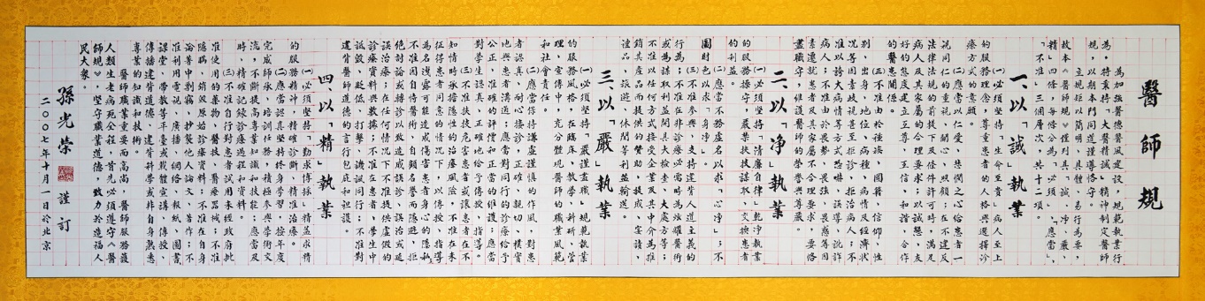 《醫(yī)師規(guī)》是國醫(yī)大師孫光榮先生為立人先立德、育人先育德于2007年10月1日為本門同道制定的。2007年1月20日、3月1日新華社《經(jīng)濟參考報》及新華社客戶端先后發(fā)表了何清湖、劉蔚《國醫(yī)大師孫光榮所倡〈醫(yī)師規(guī)〉解讀》和《立規(guī)立矩 樹立中醫(yī)藥行業(yè)倫理規(guī)范》的文章,引發(fā)了行業(yè)討論和思考。