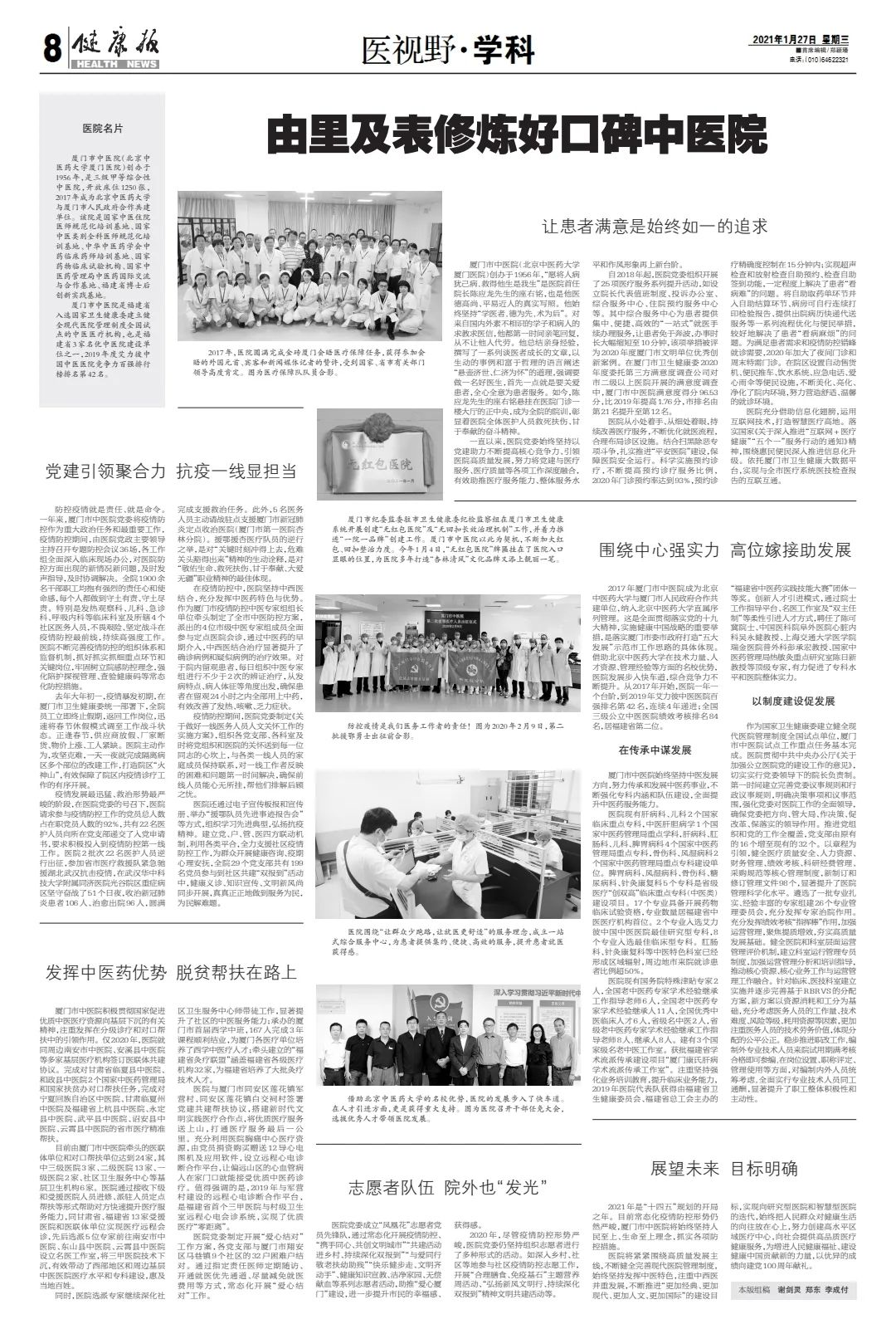 1月27日,《健康報》以《由里及表修煉好口碑中醫院》為題,整版報道我校第八臨床醫學院(廈門醫院),全文如下: