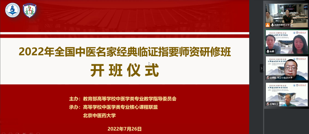 為持續(xù)促進(jìn)中醫(yī)藥傳承創(chuàng)新發(fā)展,進(jìn)一步落實(shí)全國(guó)中醫(yī)藥大會(huì)及《關(guān)于加強(qiáng)新時(shí)代中醫(yī)藥人才工作的意見》文件精神,以中醫(yī)藥經(jīng)典理論教師、臨床帶教教師為重點(diǎn),培養(yǎng)造就一批教學(xué)名師和優(yōu)秀教學(xué)團(tuán)隊(duì),提高全國(guó)中醫(yī)學(xué)專業(yè)教師與臨床醫(yī)師的中醫(yī)經(jīng)典臨床運(yùn)用能力及教學(xué)能力,7月26日下午,由教育部高等學(xué)校中醫(yī)學(xué)類專業(yè)教學(xué)指導(dǎo)委員會(huì)(以下簡(jiǎn)稱中醫(yī)教指委)主辦、高等學(xué)校中醫(yī)學(xué)類專業(yè)四大經(jīng)典課程聯(lián)盟與北京中醫(yī)藥大學(xué)共同承辦的“2022年全國(guó)中醫(yī)名家經(jīng)典臨證指要師資研修班”隆重開班。