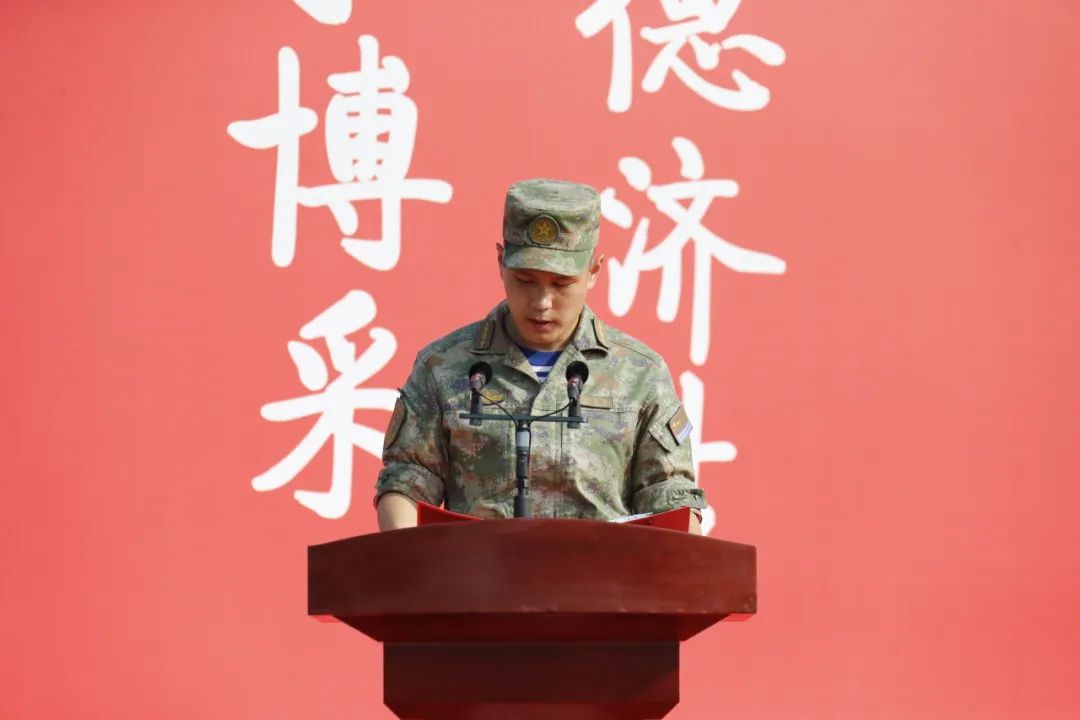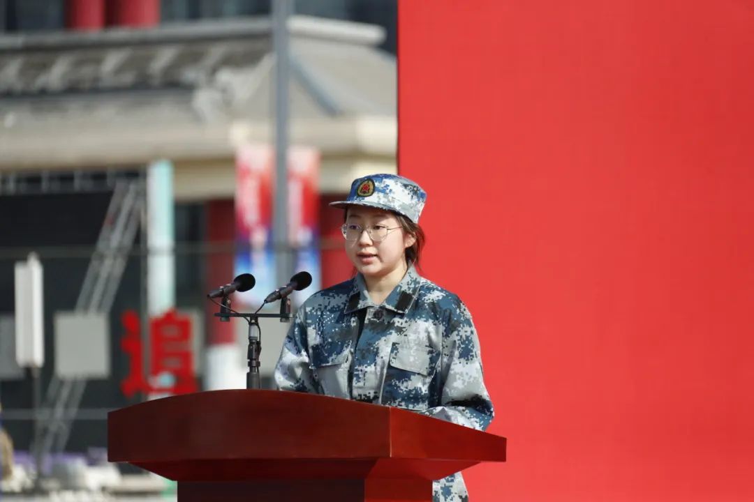 中醫學院2023級王楚宣同學作為新生代表發言。她號召全體同學在軍訓中要對自己高標準、嚴要求,嚴守軍紀,服從教官,一切行動聽指揮,發揚團結互助的優良作風,認真參加訓練,以頑強拼搏的精神面貌,展現新時代中醫學子風采。