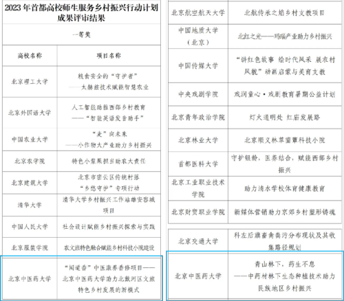 近日,北京市委教育工委、北京市教委公布了2023年首都高校師生服務(wù)鄉(xiāng)村振興行動(dòng)計(jì)劃成果評(píng)選結(jié)果,我校報(bào)送的兩個(gè)社會(huì)實(shí)踐項(xiàng)目全部獲獎(jiǎng)。其中“‘聞道香’中醫(yī)康養(yǎng)香修項(xiàng)目”榮獲一等獎(jiǎng),“青山林下,藥生不息”項(xiàng)目榮獲三等獎(jiǎng)。