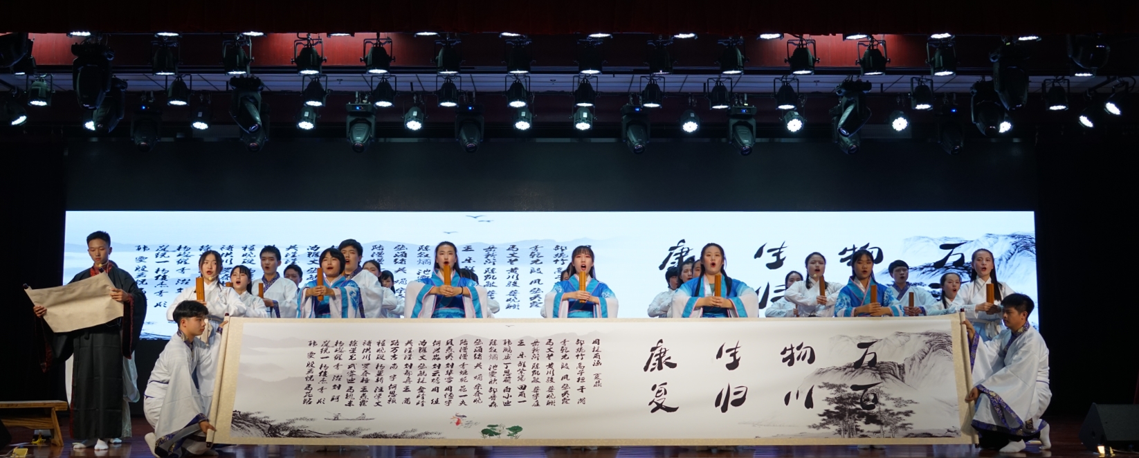 6支隊伍逐一登場。針推學院18康復治療班的同學們率先呈現《黃帝內經》選段和大醫精誠片段,他們懷揣著對古籍經典的尊崇敬畏為觀眾展現了一場精彩表演,并將錚錚誓言銘刻于班訓之中。中醫學院17級京華一班的同學們用心體會醫圣張仲景的從醫初心和行醫之道,用誦讀展現醫圣將胸中萬千悲痛轉化為對醫學的孜孜求索,傾畢生心血于《傷寒雜病論》的人生歷程。針推學院18級針推班的朗誦聲將《黃帝內經之四氣調神大論篇》的千年古韻縈繞在場,一同領悟古代先賢對陰陽四時的認知,將中醫人萬世情懷化為激勵學子的不竭動力。針推學院17級卓越針推班通過對《仁醫極源》的誦讀,昭示了北中醫學子探求中醫之源,勤求古訓、博采眾方,用所學之術護佑蒼生安康的神圣使命。伴《古今醫鑒》合誦之聲,中醫學院17級中醫學五年制二班的同學們身著一襲白衣,懷著至精至微之心,求索至艱至難之道,只盼救至疾至厄之人。以此箴言,立仁醫之志,明醫者之道。最后一支出場的針推學院16級卓越針推班虔心合誦《九針十二原》。佩蘭而廣藿香,厚樸而使君子。他們銘記班訓:全面發展,追夢不息;他們牢記夢想:勤求醫道,博采眾長;他們不忘初心:學貴沉潛,思貴專一,大醫之道,志在精誠。六支參賽隊以經典合誦,再一次向世人昭告,中醫生于如火烈烈的遠古洪荒,長于歷史悠久的赤縣中華,其著作是先賢圣人的心血,乃我九州大地之瑰寶,中國文化之根脈。