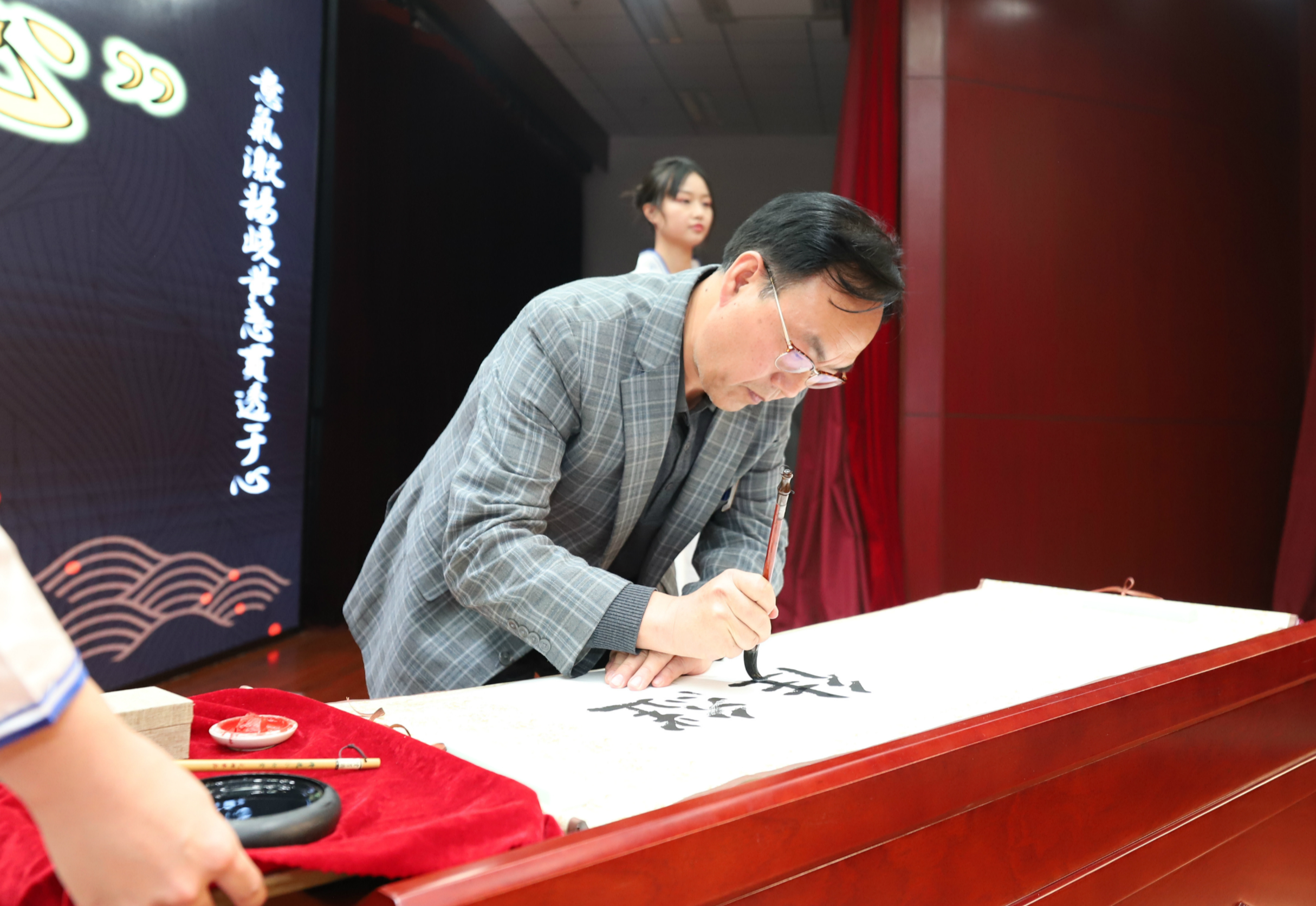 當本次活動的主旨楹聯“書香雋永吟誦聲鏗鏘在耳,意氣激揚岐黃志貫透于心”被主持人點題,針灸推拿學院趙百孝院長受邀為比賽活動親筆題寫了楹聯橫批——“繼往開來”。寓意著廣大中醫學子要繼往圣之絕學,為開創健康中國偉大事業進獻力量。