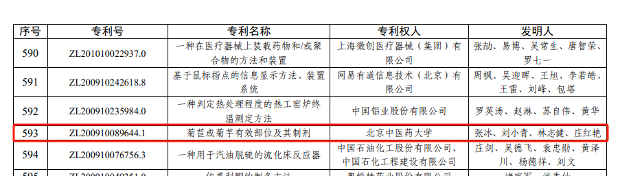 近日,國家知識產權局公布了第二十五屆中國專利獎授獎名單,我校中藥學院張冰教授團隊發明專利“菊苣或菊芋有效部位及其制劑(ZL200910089644.1)”榮獲中國專利優秀獎。至此,我校已連續2屆斬獲國家級知識產權領域大獎,標志著我校在中醫藥科技創新與成果轉化領域的持續突破。