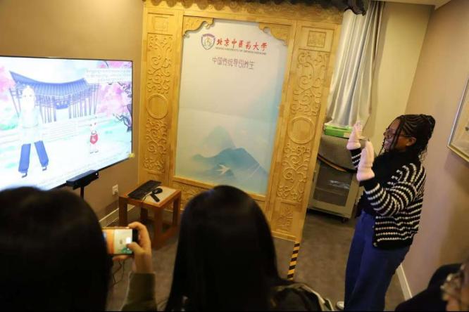 記者們參觀了一層杏林苑各展室,在百草堂品嘗中藥五味、造藥局制作艾條、針推閣感受經絡循行、四診堂體驗現代化中醫舌診儀,功夫閣跟練導引功法,通過我校中醫國際傳播協會學生志愿者的講解,記者們對中醫藥文化有了初步了解。