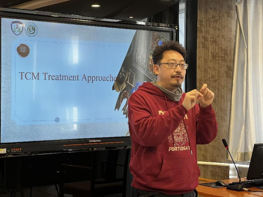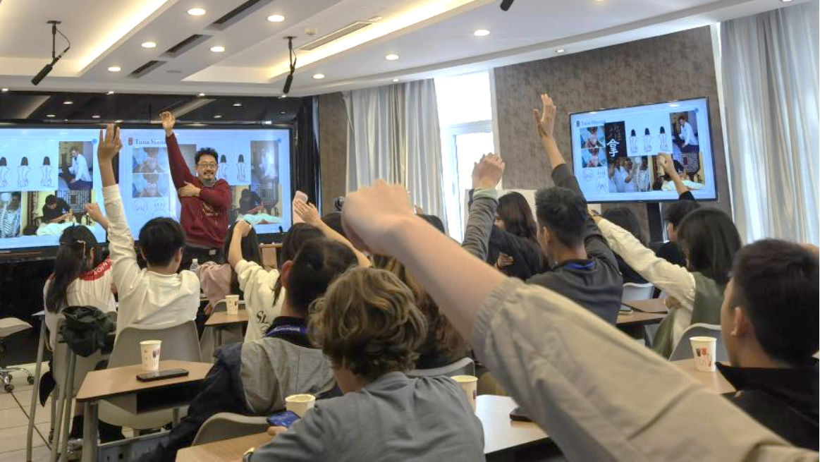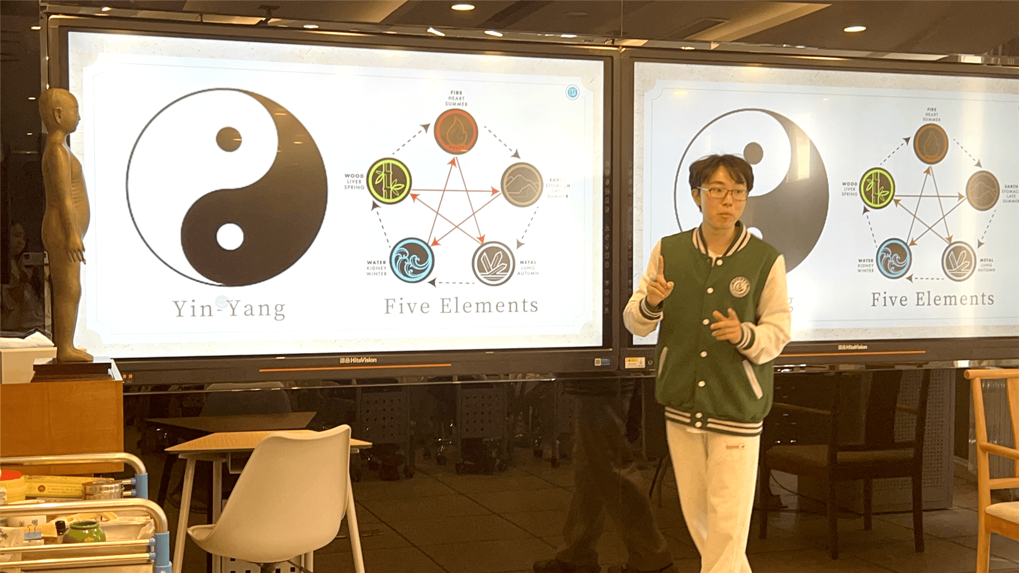 此次活動由一場主題為“Yin Yang You:Boohacking with ancient codes”的全英文講座拉開序幕。我校王樂鵬副教授以及中醫(yī)國際傳播協會骨干、我校2020級中醫(yī)專業(yè)留學生王天一同學共同主講,為師生們講述了中醫(yī)藥的基礎理論,演示了中醫(yī)特色療法,帶領師生們走入中醫(yī)藥的世界。