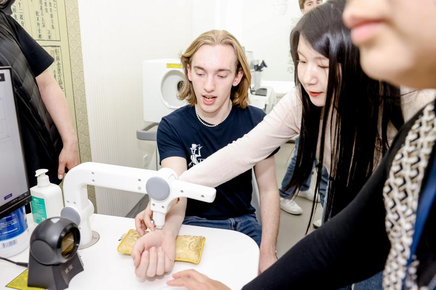 作為文化互鑒的特邀使者,藍甲蟲合唱團成員深度體驗了中醫藥文化的精髓。在中醫診斷虛擬仿真實訓室“中醫診斷艙”中,外賓通過舌診、脈診等互動項目,直觀感受傳統醫學的診療智慧。專業教師團隊同步講解經絡穴位與中醫基礎理論,激發訪客的濃厚興趣。