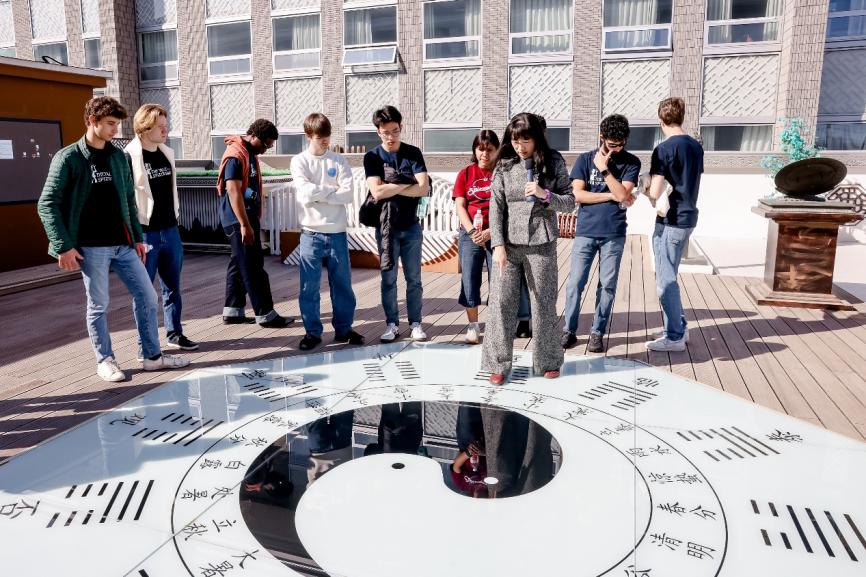 在深入體驗了中醫診療的奧秘后,藍甲蟲合唱團成員參觀“觀天閣”古天文儀器展區,對中國古代計時工具“漏刻”的精密設計贊嘆不已。在“10秒中醫藥體驗館”——曾亮相北京冬奧會的文化展示空間中,藍甲蟲合唱團成員通過“望而知之屏”交互系統,沉浸式體驗中醫藥科普短視頻、五禽戲養生功法及五音療法等特色項目,領略傳統醫學與現代科技的創新融合。
