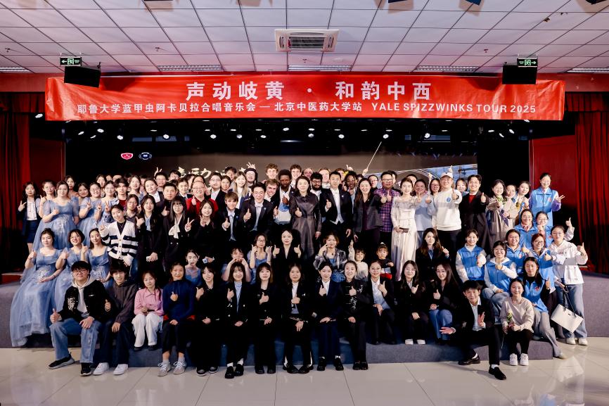 3月19日,北京中醫藥大學團委與耶魯大學藍甲蟲阿卡貝拉人聲樂團(簡稱藍甲蟲合唱團)聯合舉辦“聲動岐黃·和韻中西”主題文化交流活動,擁有111年歷史的耶魯大學藍甲蟲合唱團受邀到訪,北京中醫藥大學黨委副書記張繼旺、房山區團區委書記劉堯及校內外師生代表共同出席活動。本次活動以“體驗、探索、共創”為核心,通過沉浸式文化參訪、學術互動與聯合演出,搭建中西文化互鑒的橋梁。