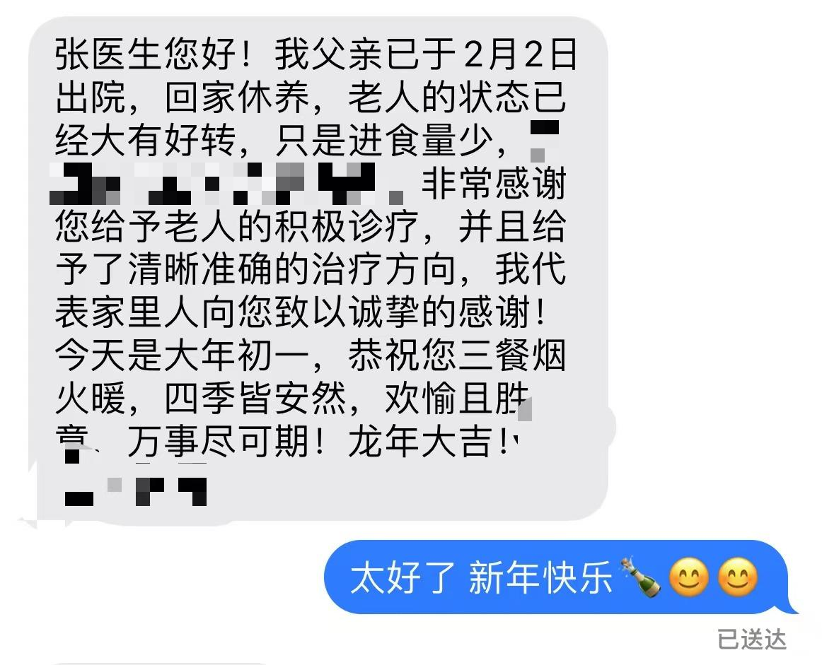 “叮叮”手機震動,屏幕亮起,一條短信打破了春節的喜慶氛圍,將我拉回到一個月前那緊張的救治時刻。 “張醫生您好!我父親已于2月2日出院,回家休養,老人的狀態已經大有好轉,只是進食量少……非常感謝您給予老人的積極診療,并且給予了清晰準確的治療方向,我代表家里人向您致以誠摯的感謝!今天是大年初一,恭祝您三餐煙火暖,四季皆安然,歡愉且勝意,萬事盡可期!龍年大吉!”