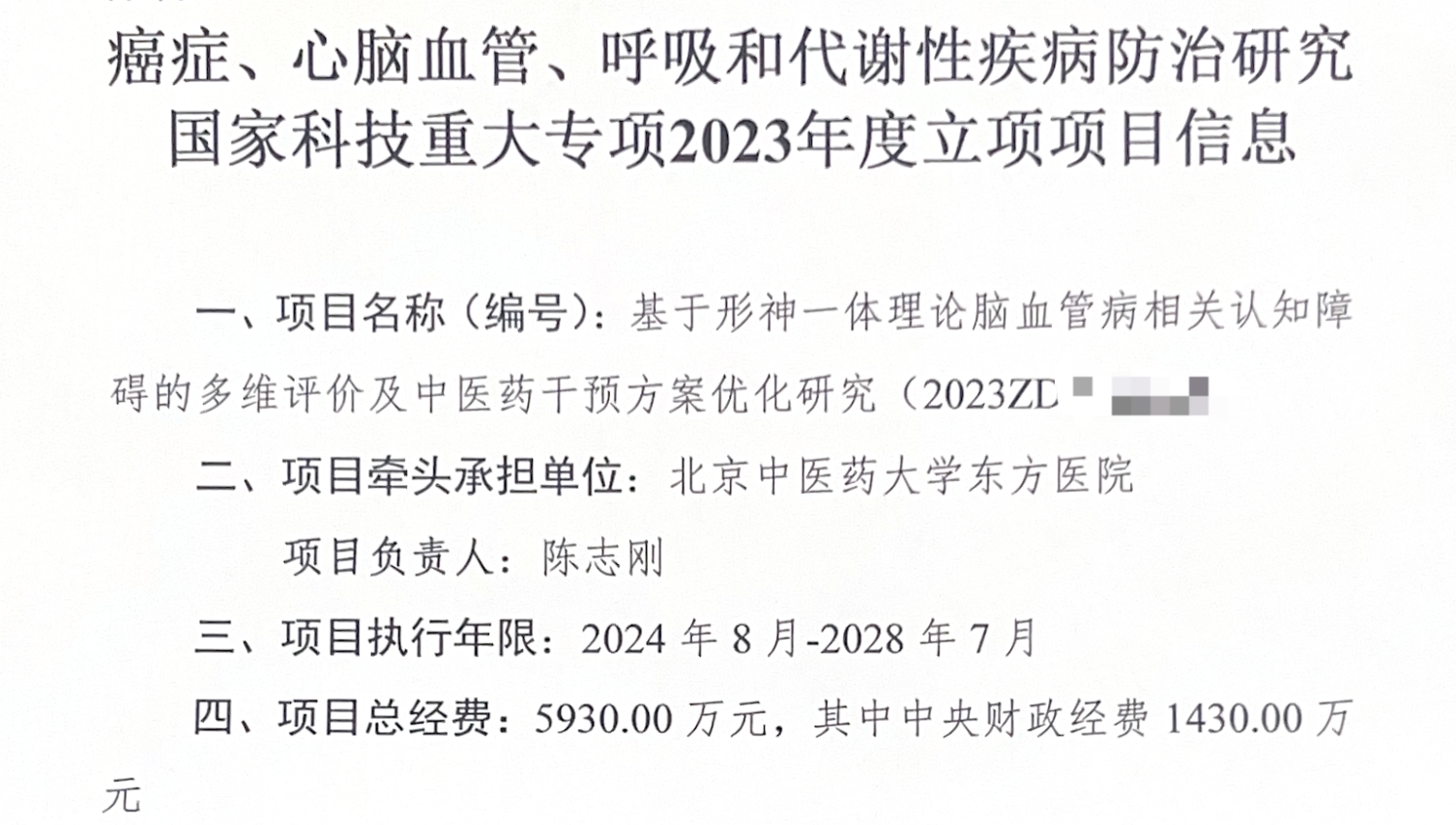 2024年,北京中醫藥大學東方醫院科研領域再獲新成果。腦病一科科室主任、國家中醫藥管理局腦病重點專科負責人陳志剛教授牽頭申報的“科技創新2030—癌癥、心腦血管、呼吸和代謝性疾病防治研究——基于形神一體理論腦血管病相關認知障礙的多維評價及中醫藥干預方案優化研究”項目正式通過評審并立項,獲批中央財政經費撥款1430萬元,為東方醫院腦病科研注入了強勁動力。