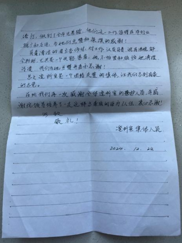 “他們都很優秀,他們醫術精湛,他們熱心為患者服務,他們守護透析患者的生命……”一封寫滿了感謝與贊揚的信,如冬日暖陽般照進了北京中醫藥大學東方醫院二七院區,這是來自30余位透析患者的心聲,字字句句都透露著深深的敬意與感激。在這歲末年初的寒冷時節,這封信如同一股暖流,溫暖了透析室所有工作人員的心房。