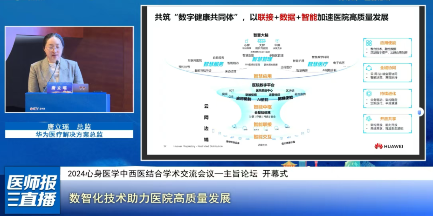 主旨論壇上,北京大學第六醫院陸林院士、國家心理健康和精神衛生防治中心王鋼副主任、北京協和醫院袁鐘教授、東南大學附屬中大醫院袁勇貴教授、杭州華大生科院宋采教授、華為醫療解決方案總監唐立瑤、北京中醫藥大學東方醫院郭蓉娟教授分別以《睡眠與睡眠相關疾病研究新進展》《科技賦能、文化鑄造-新時代背景下心理健康事業的融合發展》《與文化相適應的心身醫學》《Brain-X軸與心身疾病》《精神免疫學的過去、現在和將來》《數智化技術助力醫院高質量發展》《中醫心身醫學傳承與創新》為題作報告。