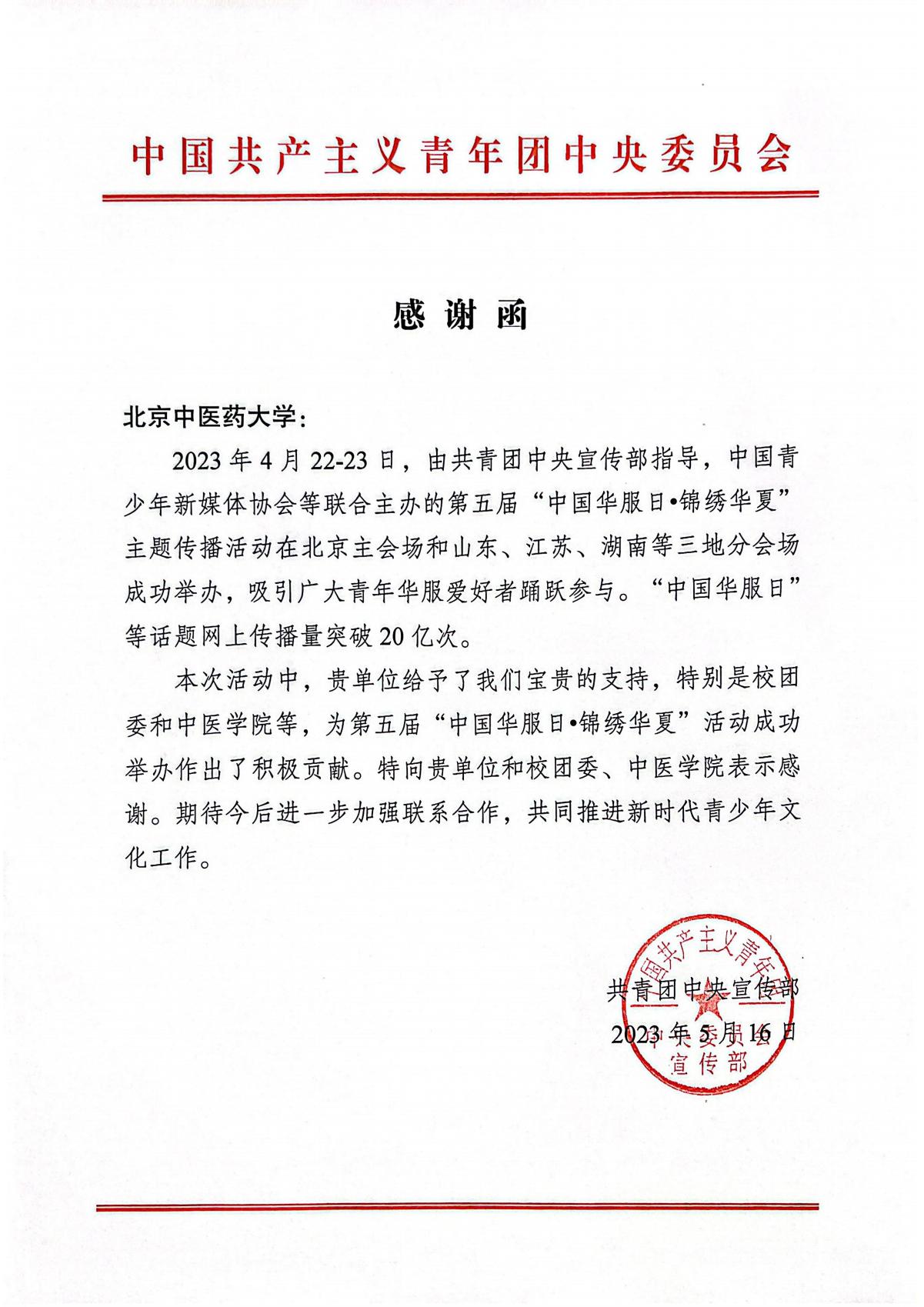 近日,我校收到共青團中央感謝函,感謝我校青年志愿者在“中國華服日”活動中的積極貢獻。