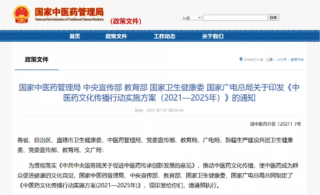 近日,國家中醫(yī)藥管理局、中央宣傳部、教育部、國家衛(wèi)生健康委、國家廣電總局五部門聯(lián)合印發(fā)《中醫(yī)藥文化傳播行動實施方案(2021—2025年)》(以下簡稱“方案”),部署推動“十四五”時期中醫(yī)藥文化傳承弘揚工作,深入挖掘中醫(yī)藥文化精髓、推動中醫(yī)藥融入生產(chǎn)生活。《方案》指出,開展中醫(yī)藥文化傳播行動是貫徹落實《中共中央國務(wù)院關(guān)于促進(jìn)中醫(yī)藥傳承創(chuàng)新發(fā)展的意見》,推動中醫(yī)藥文化傳播,使中醫(yī)藥成為群眾促進(jìn)健康的文化自覺的重要舉措。