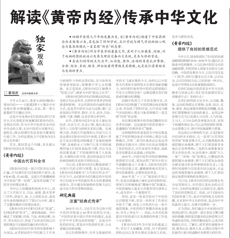 《中國中醫藥報》2016年5月16日第三版刊登我校黨委副書記、副校長翟雙慶文章——解讀《黃帝內經》 傳承中華文化
