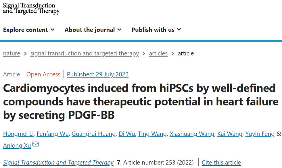 近日,我校生命科學學院徐安龍教授團隊在期刊 Signal Transduction and Targeted Therapy 在線發(fā)表題為 Cardiomyocytes induced from hiPSCs by well-defined compounds have therapeutic potential in heart failure by secreting PDGF-BB 的研究論文,徐安龍教授為論文通訊作者,論文第一作者為生命科學學院青年教師李紅梅。