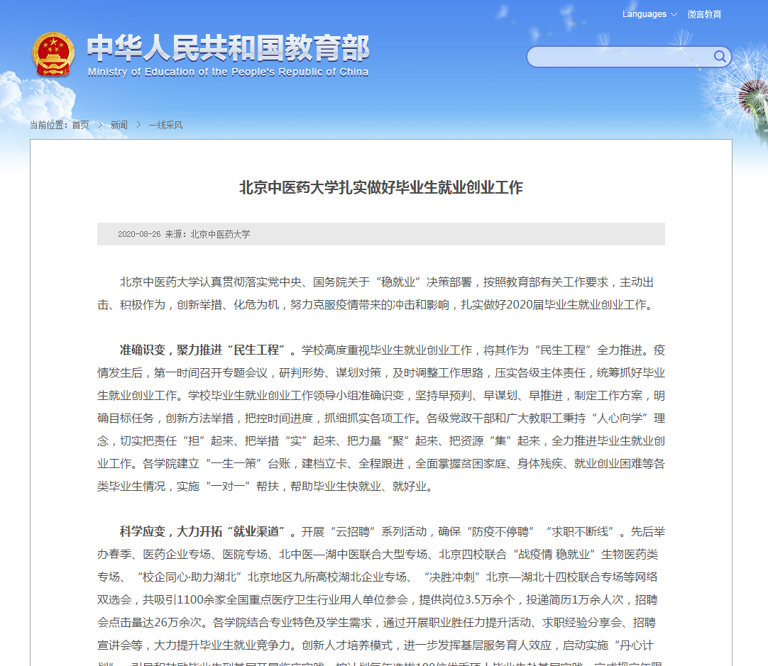 8月26日,教育部網(wǎng)站報(bào)道我校今年畢業(yè)生就業(yè)創(chuàng)業(yè)相關(guān)工作系列舉措,全文如下