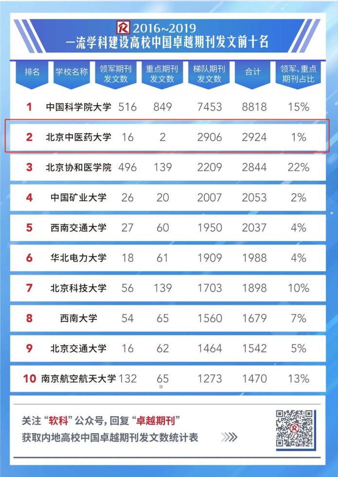 近日,高等教育評(píng)價(jià)機(jī)構(gòu)“軟科”統(tǒng)計(jì)了2016至2019年中國內(nèi)地高校在領(lǐng)軍期刊、重點(diǎn)期刊、梯隊(duì)期刊上的發(fā)文情況,分析了中國卓越期刊百強(qiáng)高校的發(fā)文現(xiàn)狀和發(fā)展?jié)摿Α?jù)統(tǒng)計(jì),2016至2019年間,中國內(nèi)地共有1728所高校在中國卓越期刊上發(fā)文。在46所一流學(xué)科建設(shè)高校中,我校的總發(fā)文數(shù)位居第二,達(dá)到了2924篇。“軟科”認(rèn)為,作為一所以中醫(yī)藥為特色的高校,能完成如此數(shù)量的發(fā)文著實(shí)不易。
