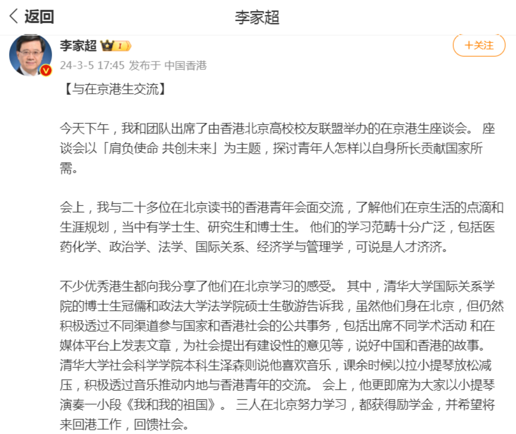 3月5日下午,我校3名中國香港籍學生(本科生2名、研究生1名)參加了由香港北京高校校友聯(lián)盟主辦的2024年在京港生座談會。香港特別行政區(qū)行政長官李家超、北京市委常委、統(tǒng)戰(zhàn)部部長楊晉柏,北京市政協(xié)黨組副書記、副主席崔述強,以及京港兩地有關(guān)部門領(lǐng)導出席,和來自11所高校不同專業(yè)的24位在京香港青年座談交流,了解他們的學習和生活情況,我校3位港生參加座談。